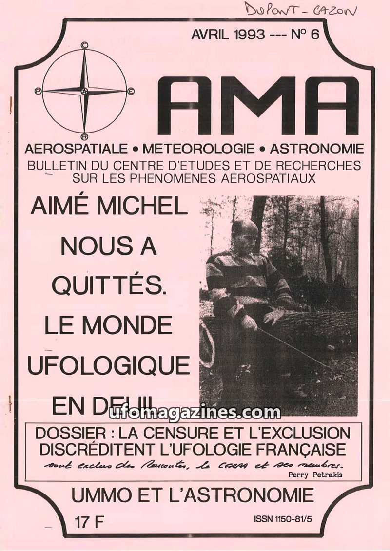 This issue of AMA magazine (April 1993) is dedicated to the memory of Aimé Michel, a pioneer in ufology. It includes a dossier on censorship and exclusion discrediting French ufolo