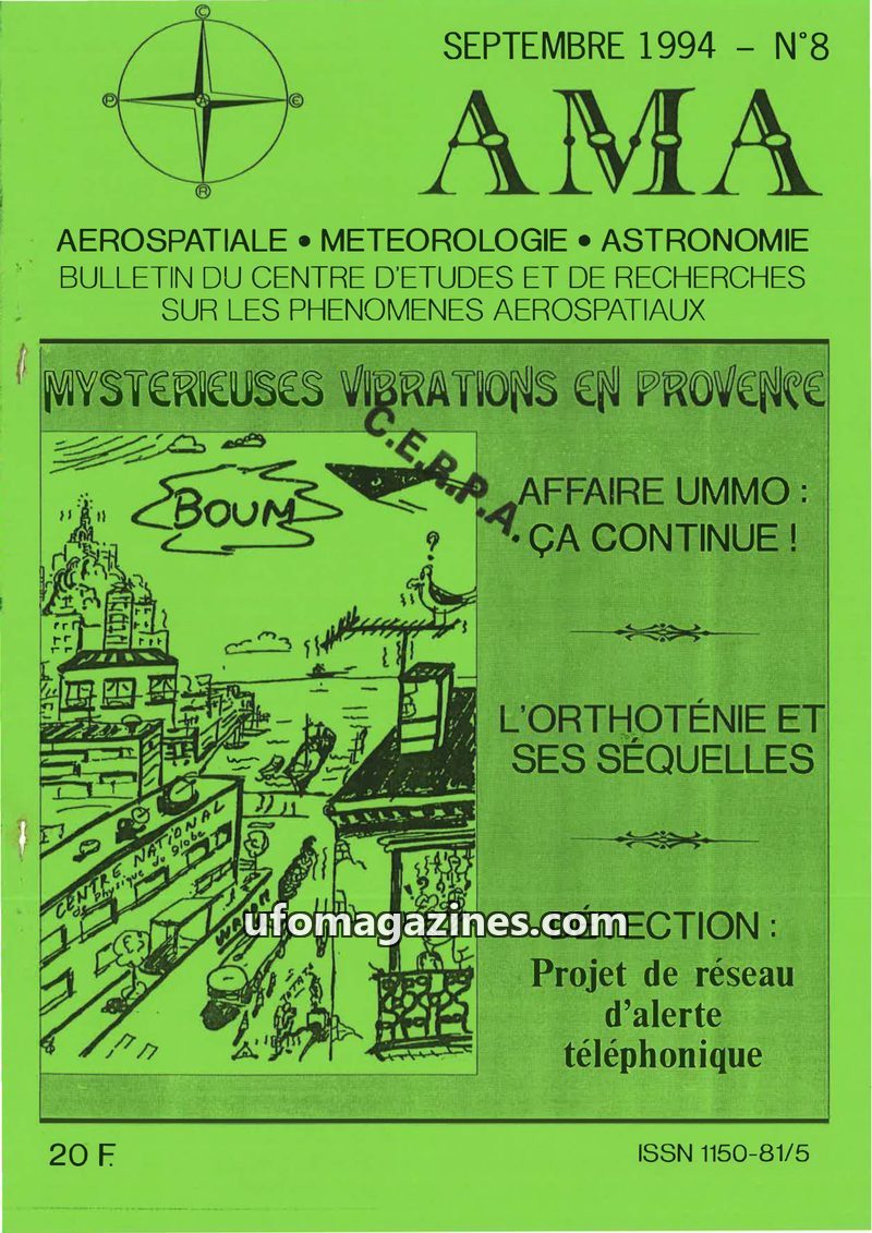 This issue of AMA magazine, published in September 1994, focuses on 'Mysterious Vibrations in Provence' and the ongoing 'UMMO Affair'. It features articles on the nature of UFO phe