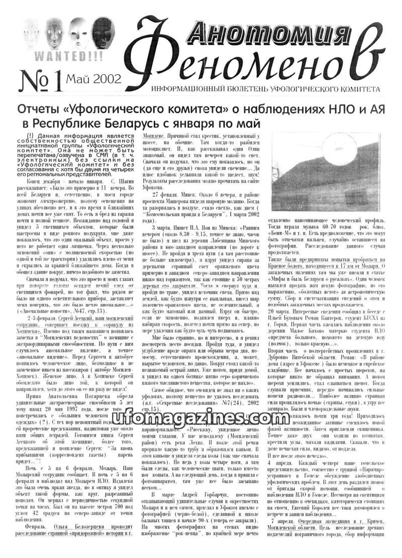 This issue of Anomaliya Magazine, published in May 2002 by the Ufological Committee, details various UFO and anomalous phenomenon (AP) sightings and investigations across Belarus f