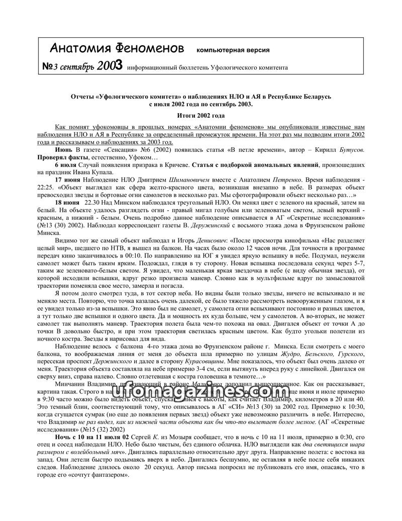This issue of 'Anatomy of Phenomena' compiles UFO and anomalous phenomena reports from Belarus spanning from July 2002 to September 2003. It details numerous sightings, including s