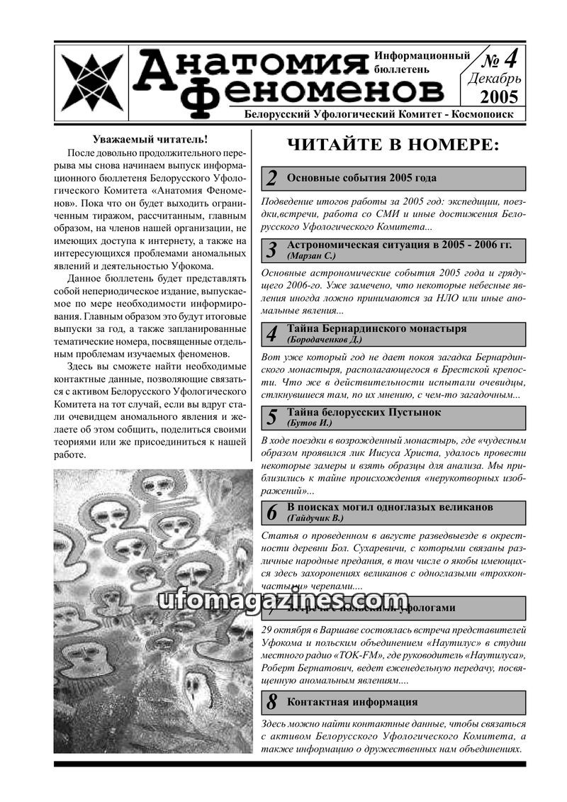 The Belarusian Ufological Committee relaunches its informational bulletin 'Anatomy of Phenomena' with issue 4 in December 2005. This issue covers the committee's activities in 2005