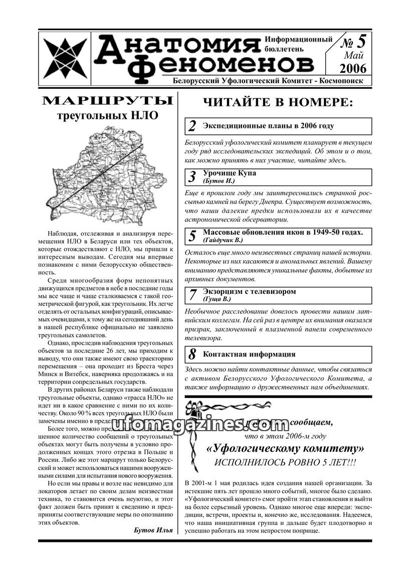 This issue of 'Anatomy of Phenomena' from May 2006 delves into various unexplained phenomena. A lead article by Ilya Butov discusses the observed routes of triangular UFOs in Belar
