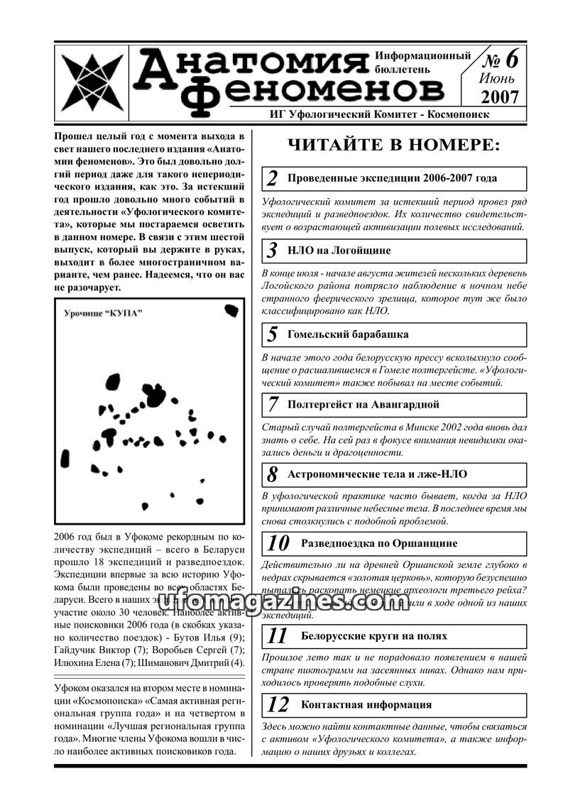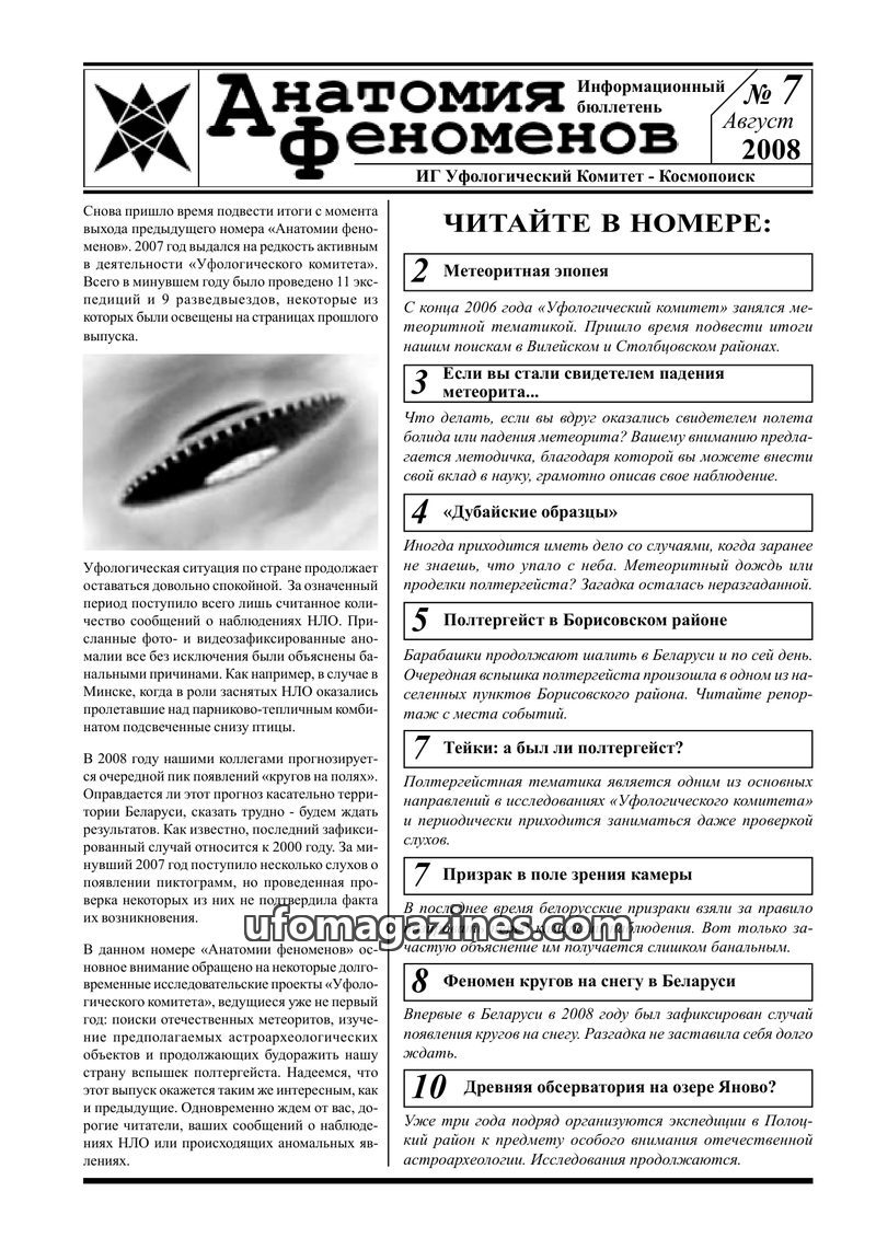 This issue of 'Anatomy of Phenomena' details numerous expeditions conducted by the 'Ufological Committee' in Belarus during 2006-2007. It covers investigations into UFO sightings i