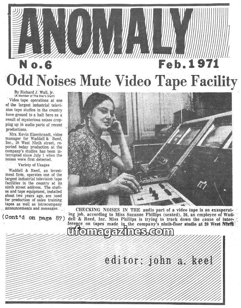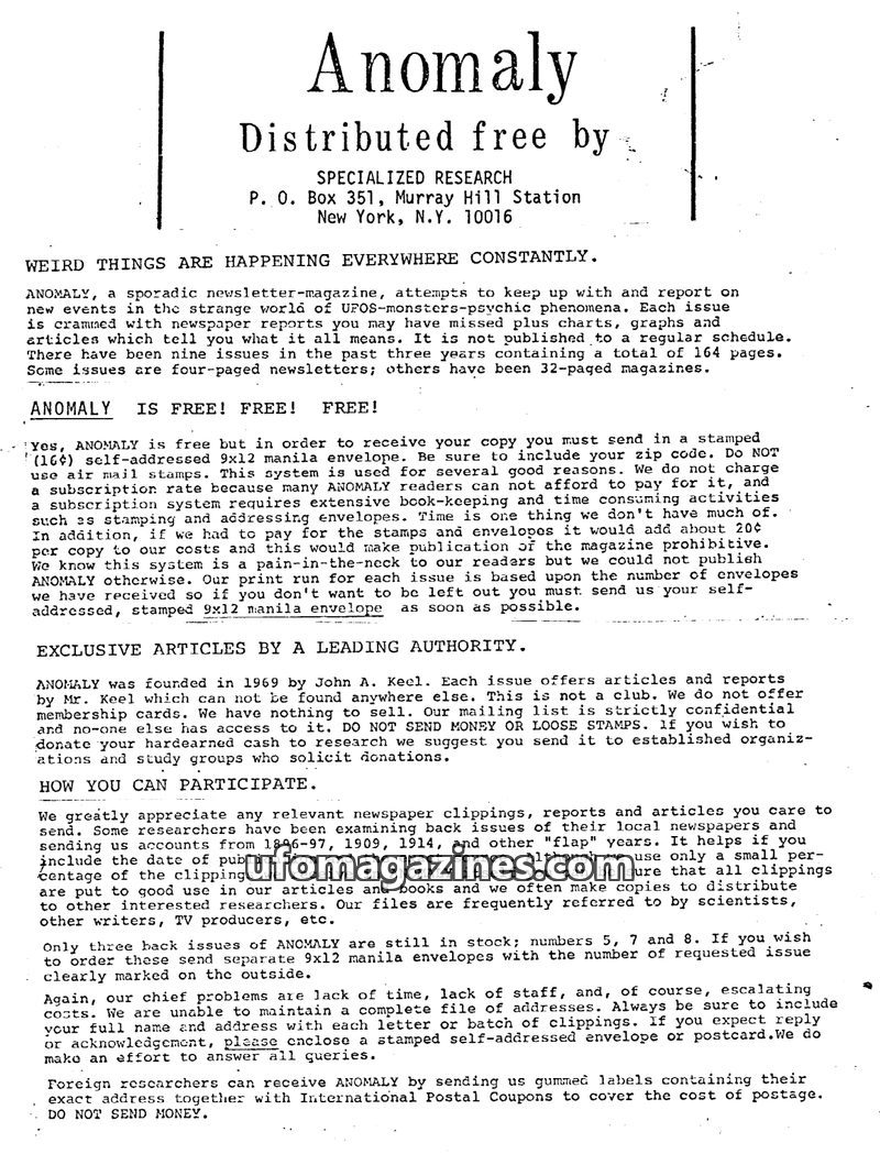 Anomaly is a free, sporadically published newsletter-magazine focusing on UFOs, monsters, and psychic phenomena. It is distributed by Specialized Research and founded by John A. Ke