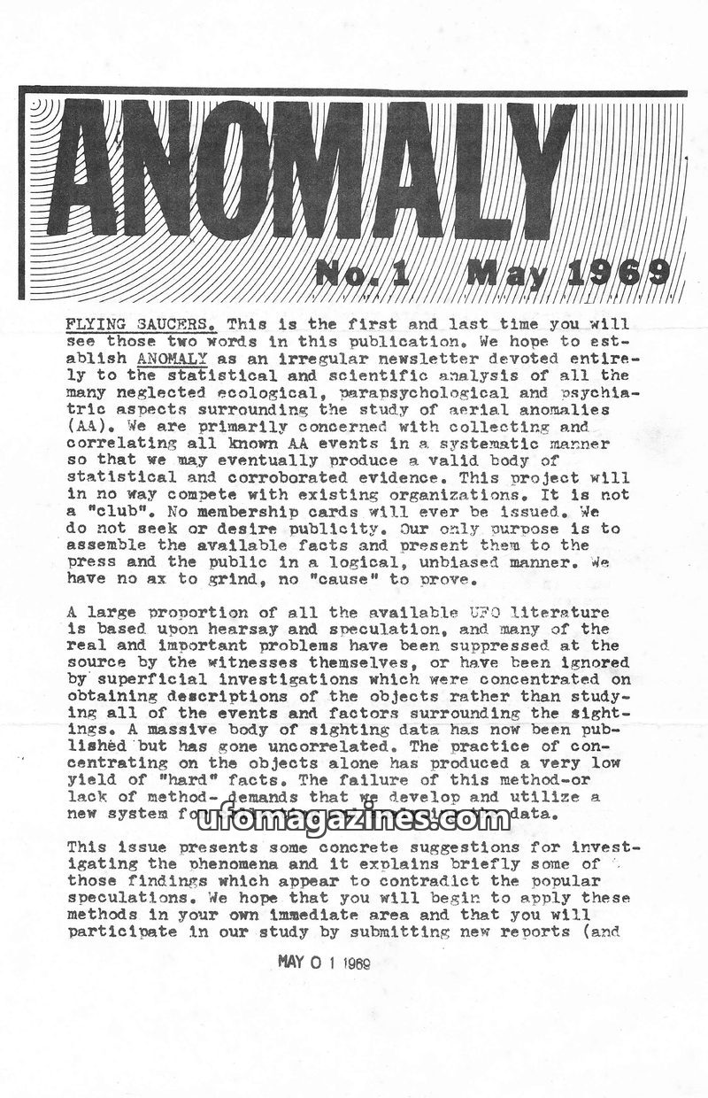 This inaugural issue of ANOMALY, an irregular newsletter, establishes its purpose: the statistical and scientific analysis of aerial anomalies (AA), moving beyond mere speculation.