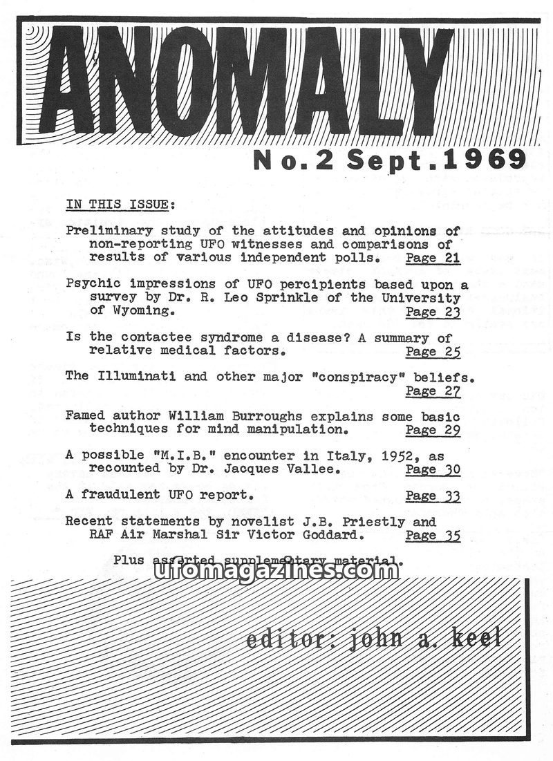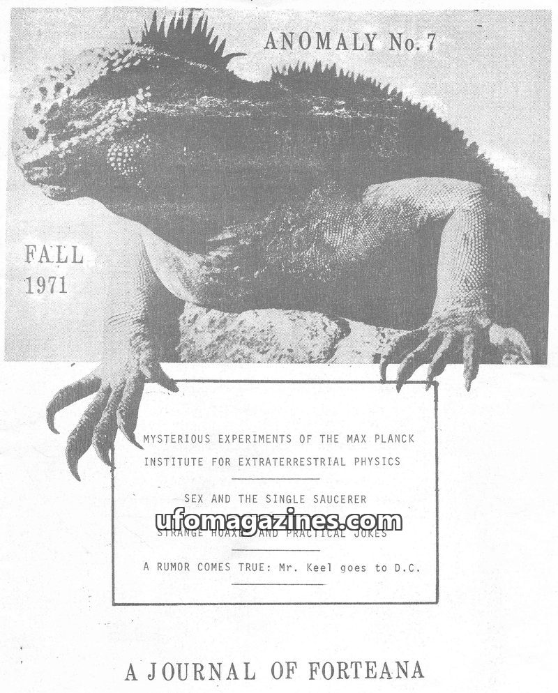 This issue of ANOMALY, edited by John A. Keel, features an article by Ivan T. Sanderson discussing his 40 years of involvement with ufology and challenging common notions about ext