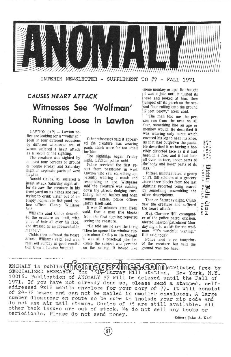 This issue of Anomaly magazine features a report on a 'wolfman' sighting in Lawton, Oklahoma, which caused one witness to suffer a heart attack. It also includes an article discuss