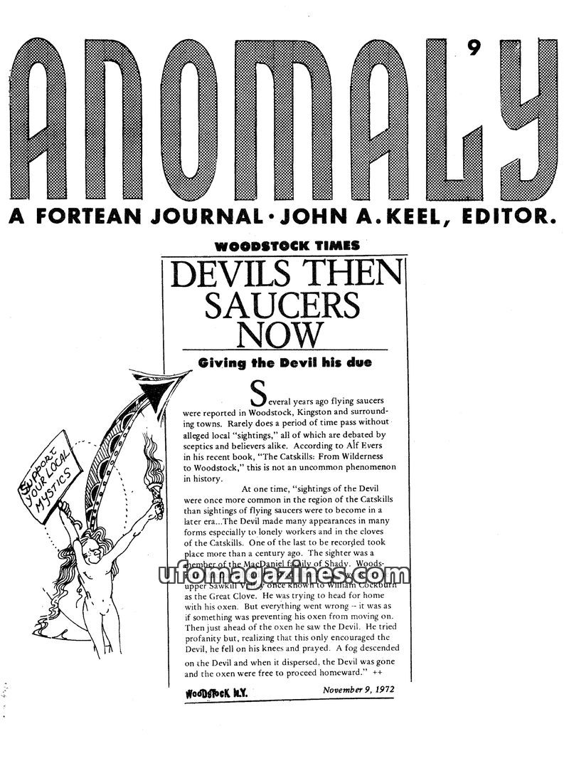 This issue of ANOMALY, dated November 9, 1972, delves into historical accounts of 'Devils' and flying saucers in the Catskills, and features an obituary for naturalist Ivan Sanders
