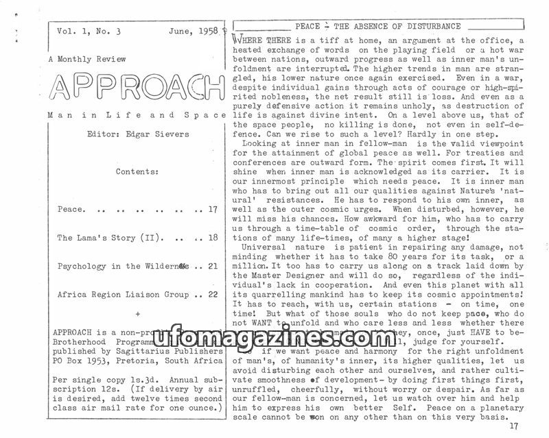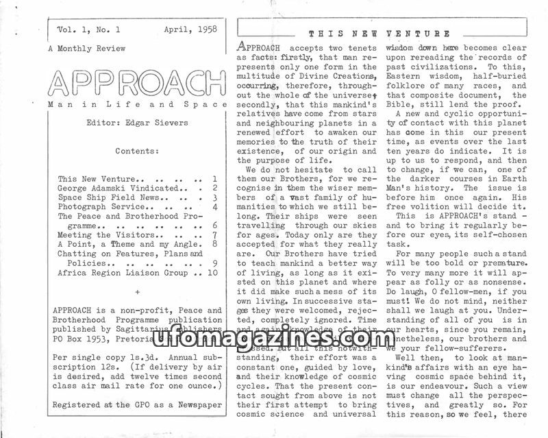 This issue of APPROACH magazine, published in April 1958, introduces 'This New Venture,' a non-profit publication focused on peace, brotherhood, and a cosmic perspective. It highli