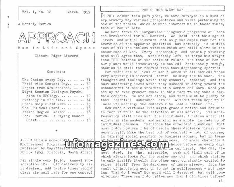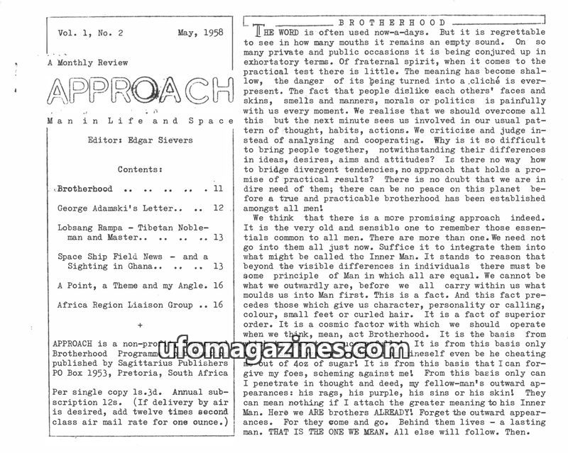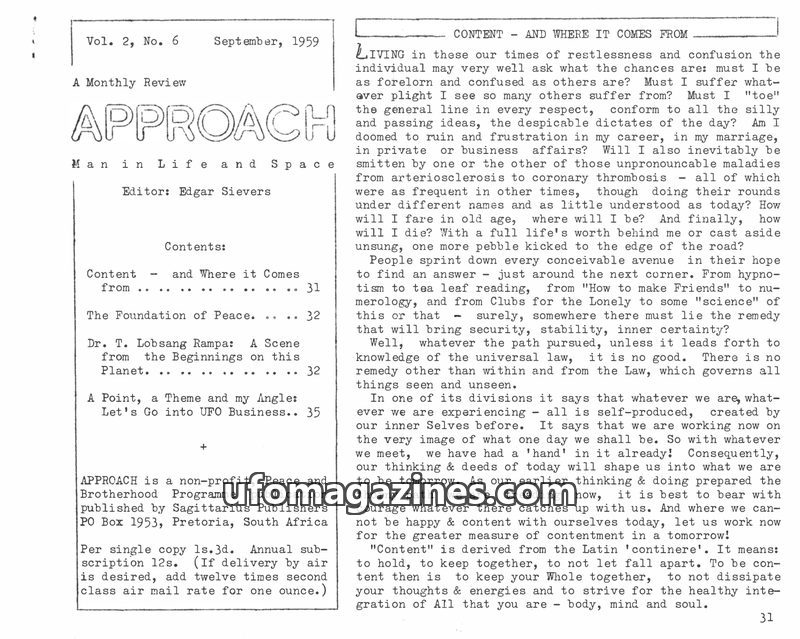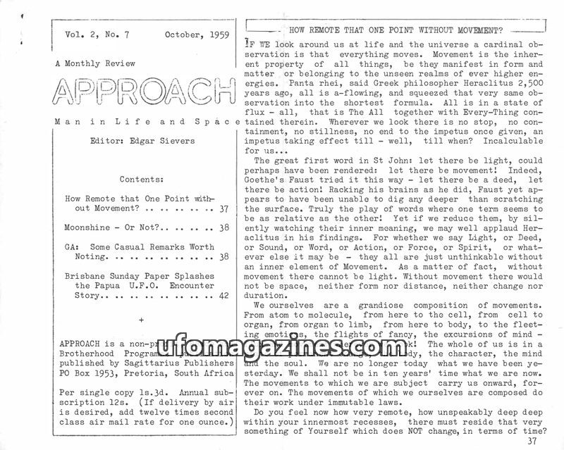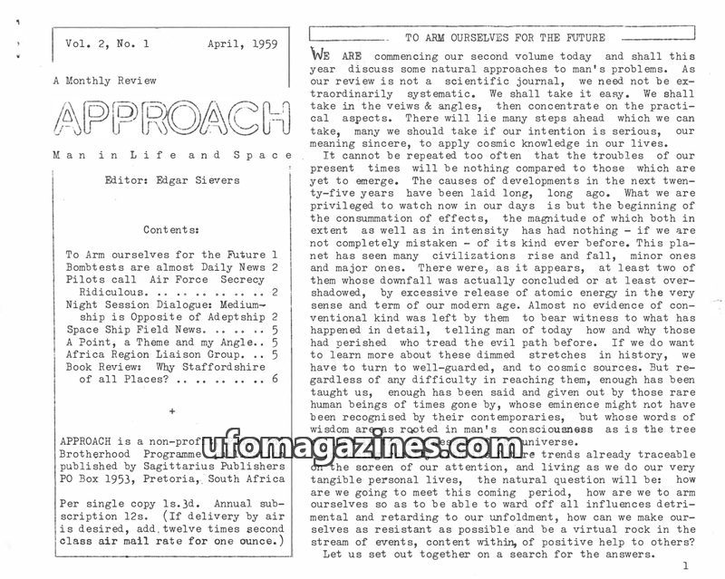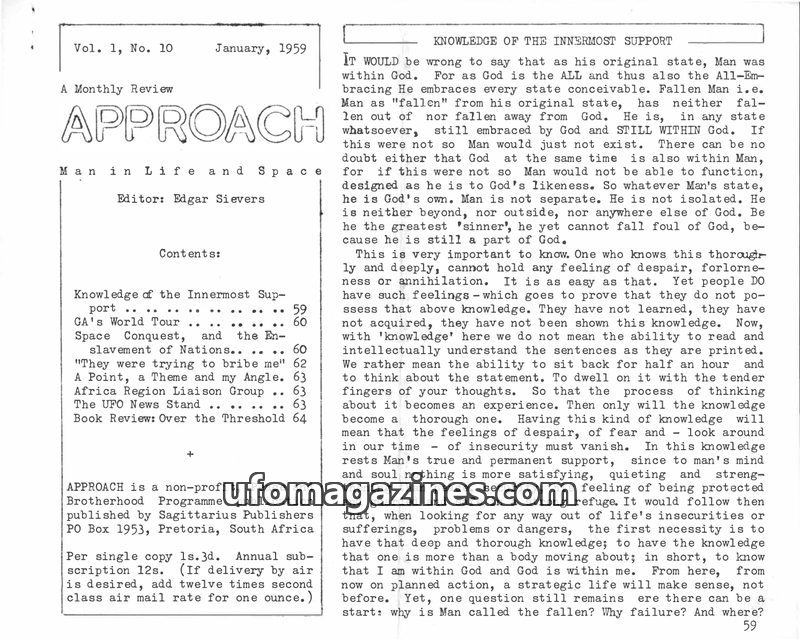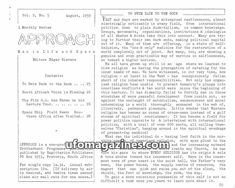 This August 1959 issue of APPROACH magazine, a monthly review from South Africa, delves into UFO sightings and related phenomena. It features an article titled 'To Swim Back to the
