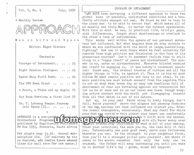 This issue of APPROACH magazine, dated July 1958, focuses on themes of inner peace, detachment from negativity, and extraterrestrial phenomena. It includes an editorial on 'Courage