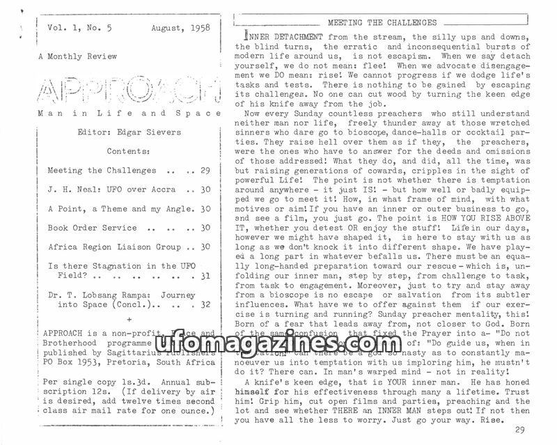This issue of Approach magazine, dated August 1958, delves into UFO phenomena and personal development. It includes a report of a UFO sighting over Accra, Ghana, and a concluding p