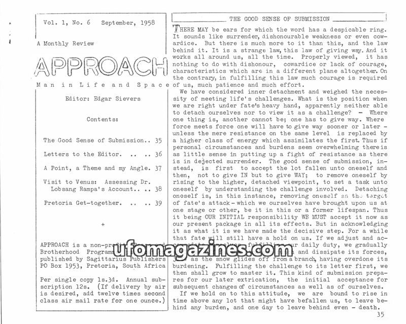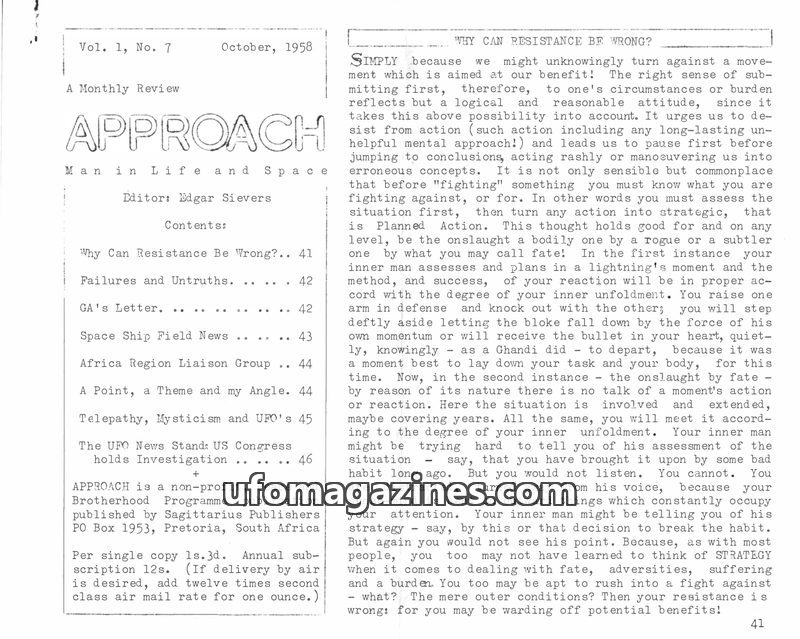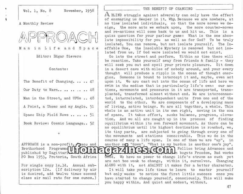 This issue of Approach magazine, dated November 1958, explores themes of personal change, adaptation to new phenomena like UFOs, and the nature of consciousness. It argues that tru