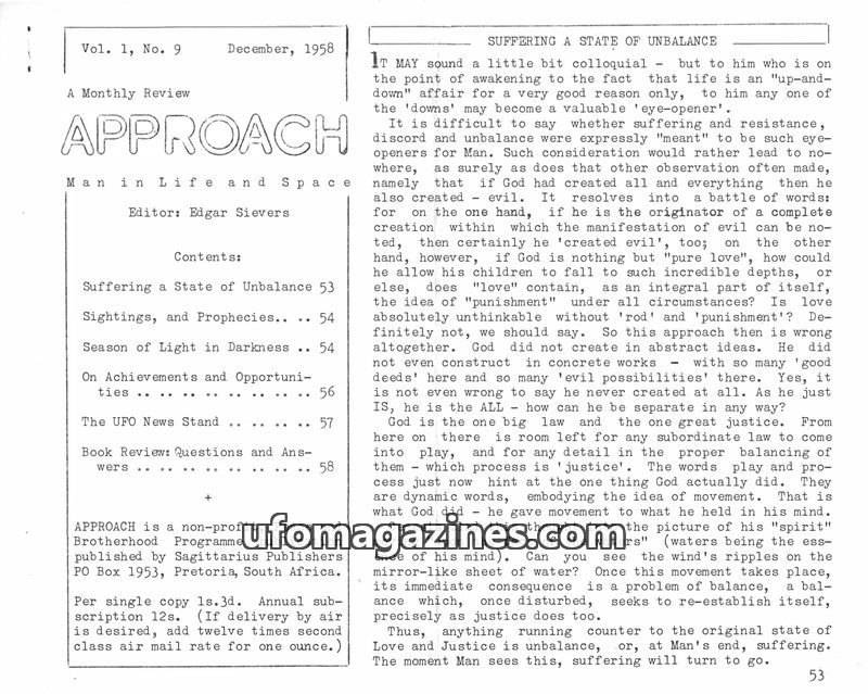 This December 1958 issue of APPROACH magazine delves into philosophical and spiritual themes, with the lead article 'Suffering a State of Unbalance' exploring the nature of evil an