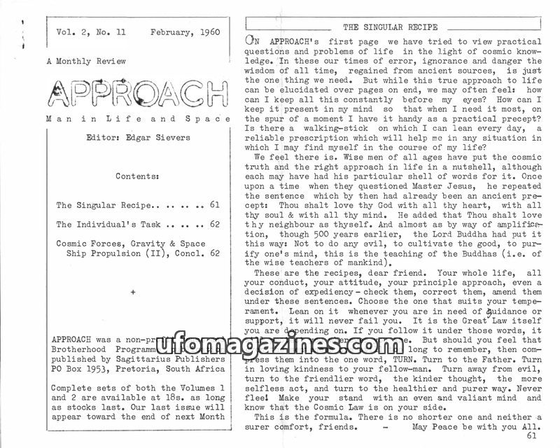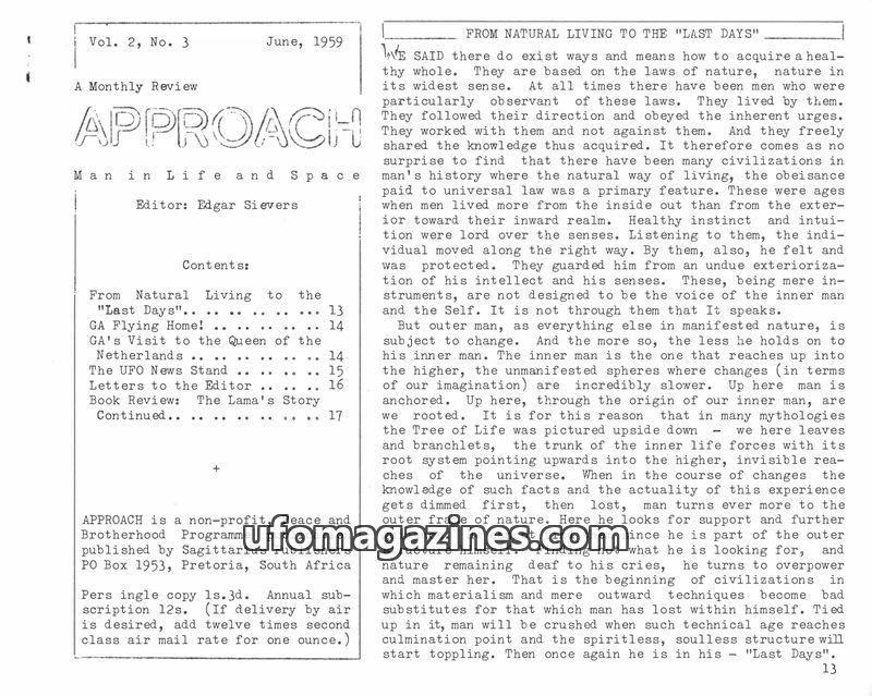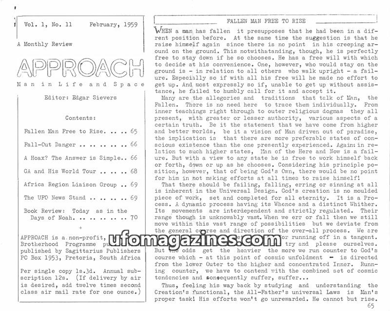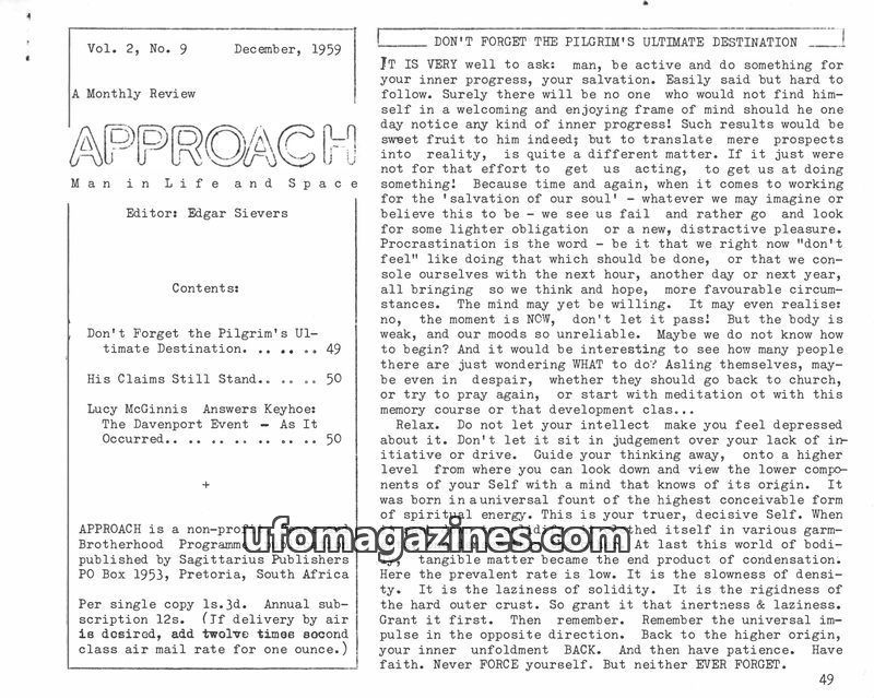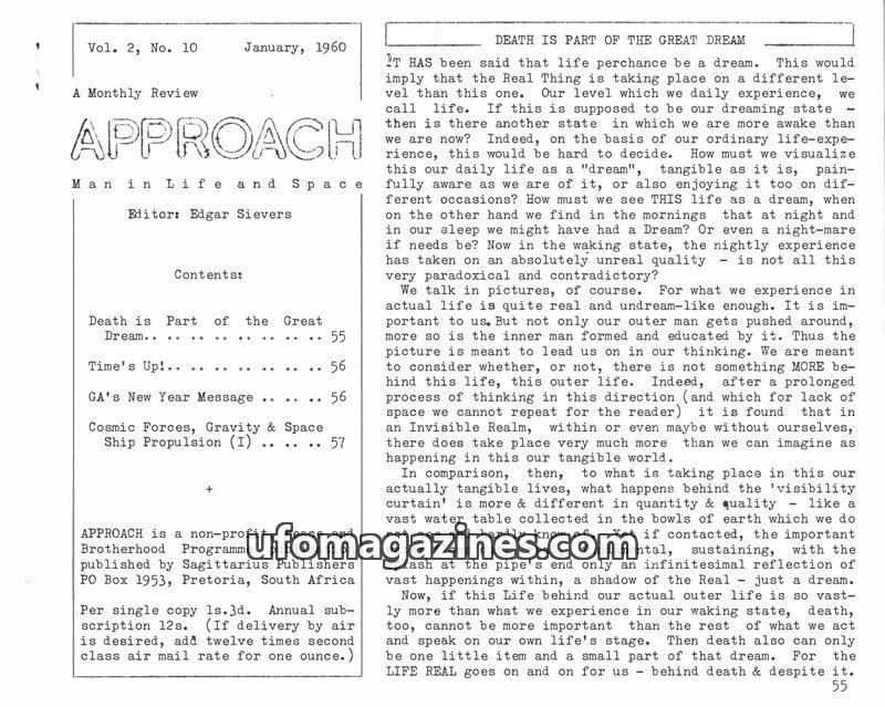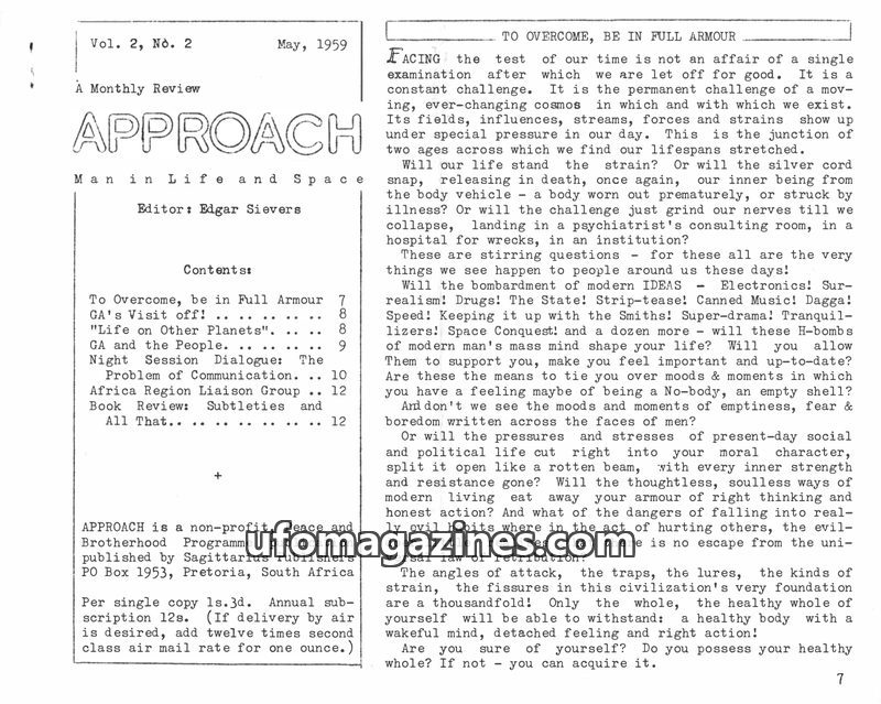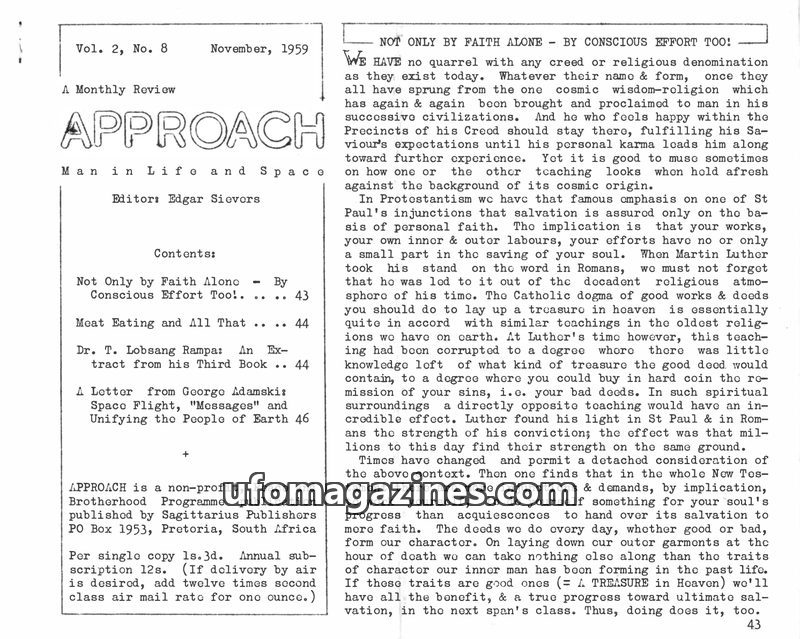 This issue of APPROACH magazine, published in November 1959, delves into spiritual and extraterrestrial themes. An editorial discusses the balance between faith and conscious effor