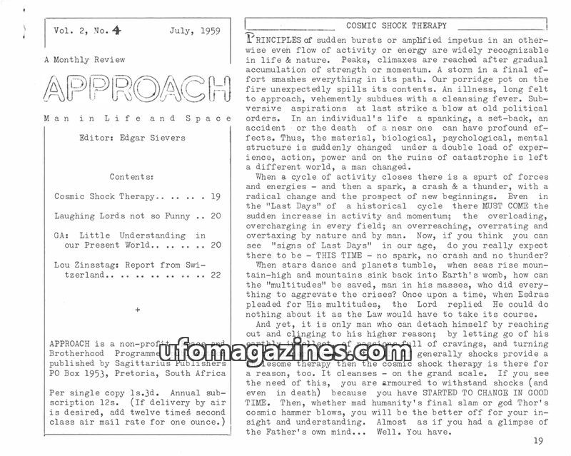 The July 1959 issue of APPROACH magazine delves into 'Cosmic Shock Therapy' as a concept of sudden, impactful change in life and nature. It also reports extensively on George Adams