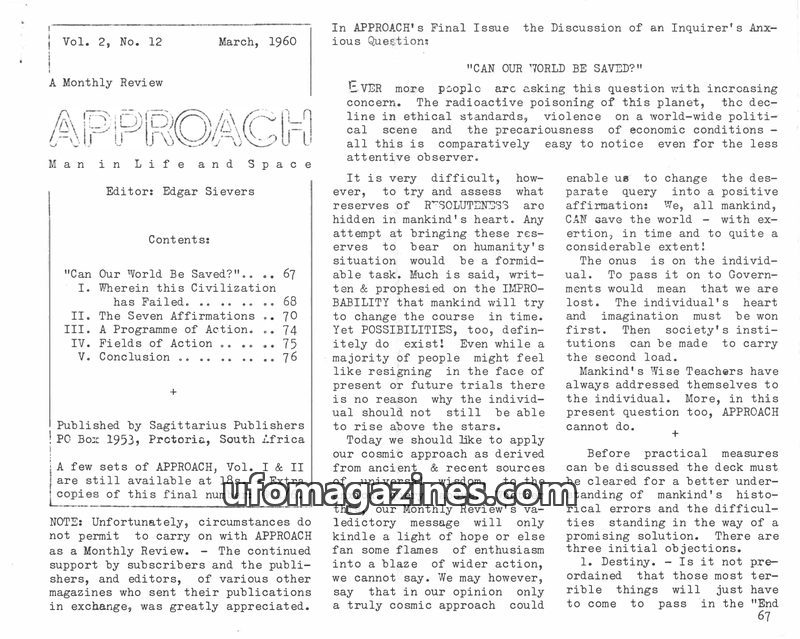 This final issue of APPROACH magazine, dated March 1960, addresses the pressing question "Can Our World Be Saved?" due to concerns like radioactive poisoning, declining ethical sta