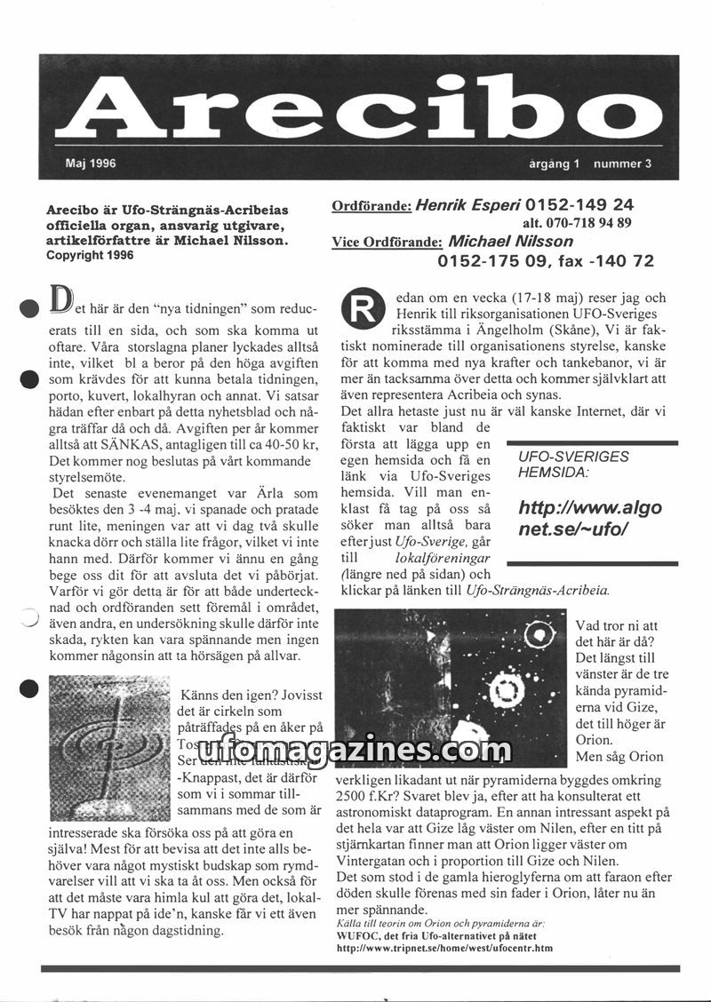 This issue of Arecibo, the official publication of Ufo-Strängnäs-Acribeia, announces a reduction in its publication format to a single page due to costs, with a lowered annual fee.