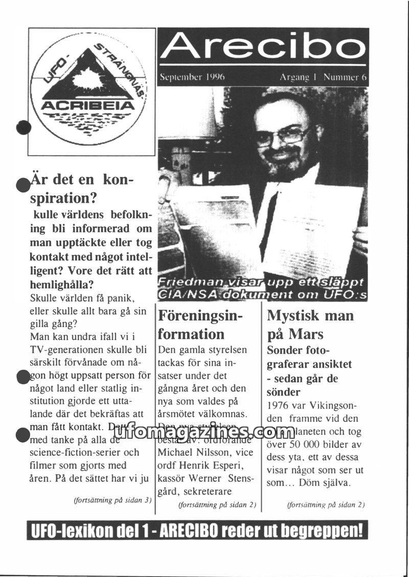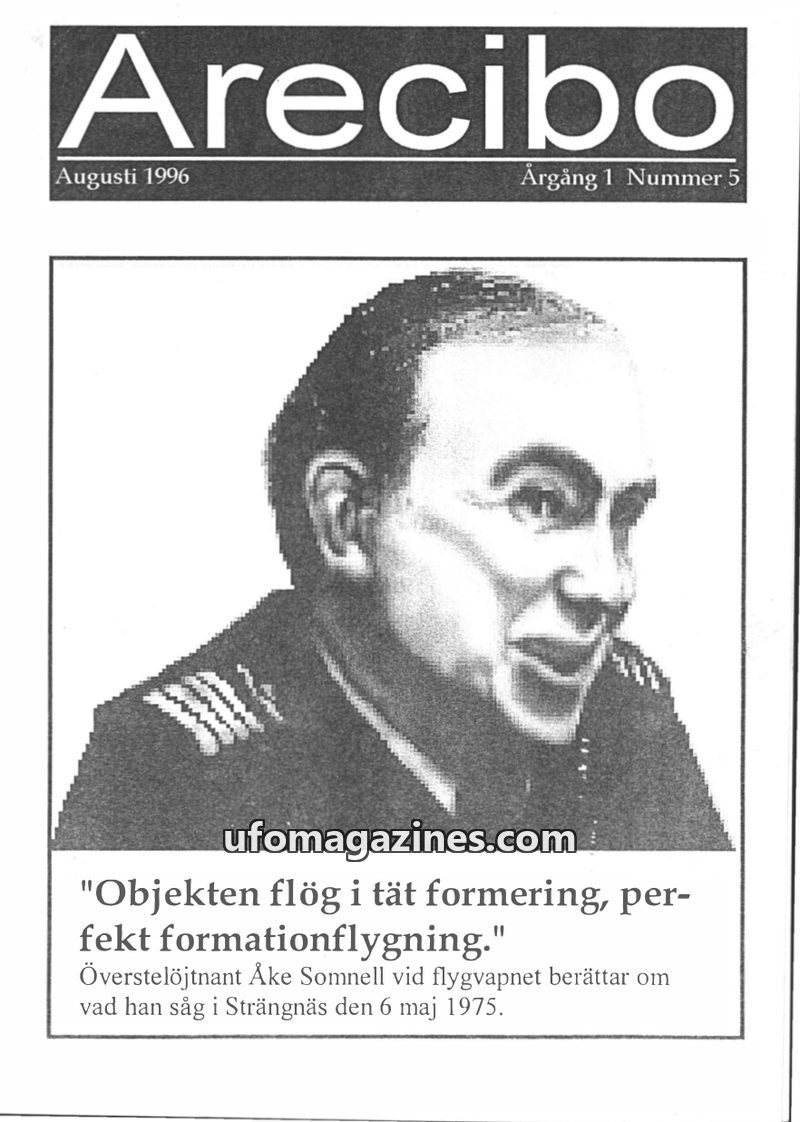 This issue of Arecibo magazine, dated August 1996, focuses on a significant UFO sighting by Swedish Air Force Lieutenant Colonel Åke Somnell in Strängnäs on May 6, 1975. Somnell de