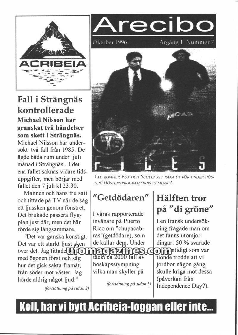 This issue of Arecibo magazine investigates two unexplained aerial phenomena sightings in Strängnäs, Sweden, during July 1985, involving a bright light and a large, rotating object
