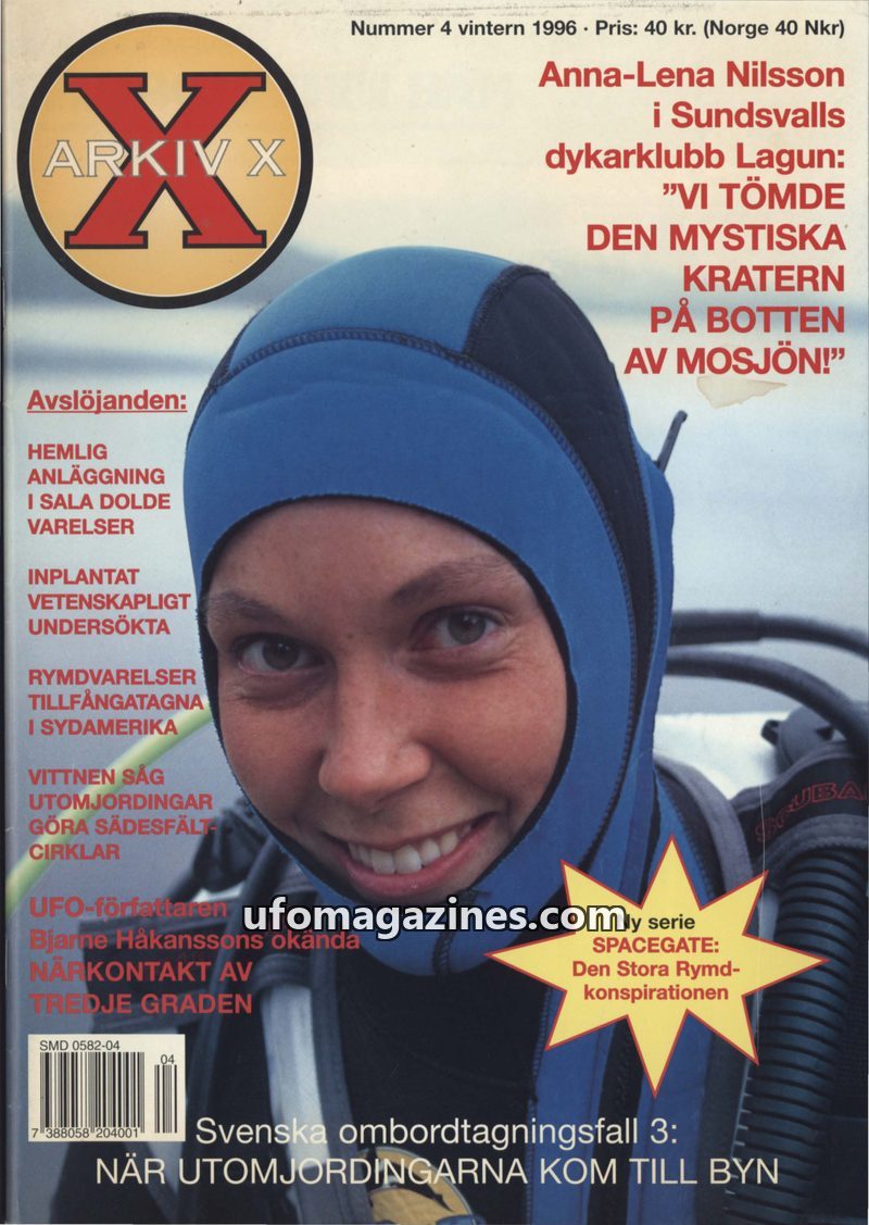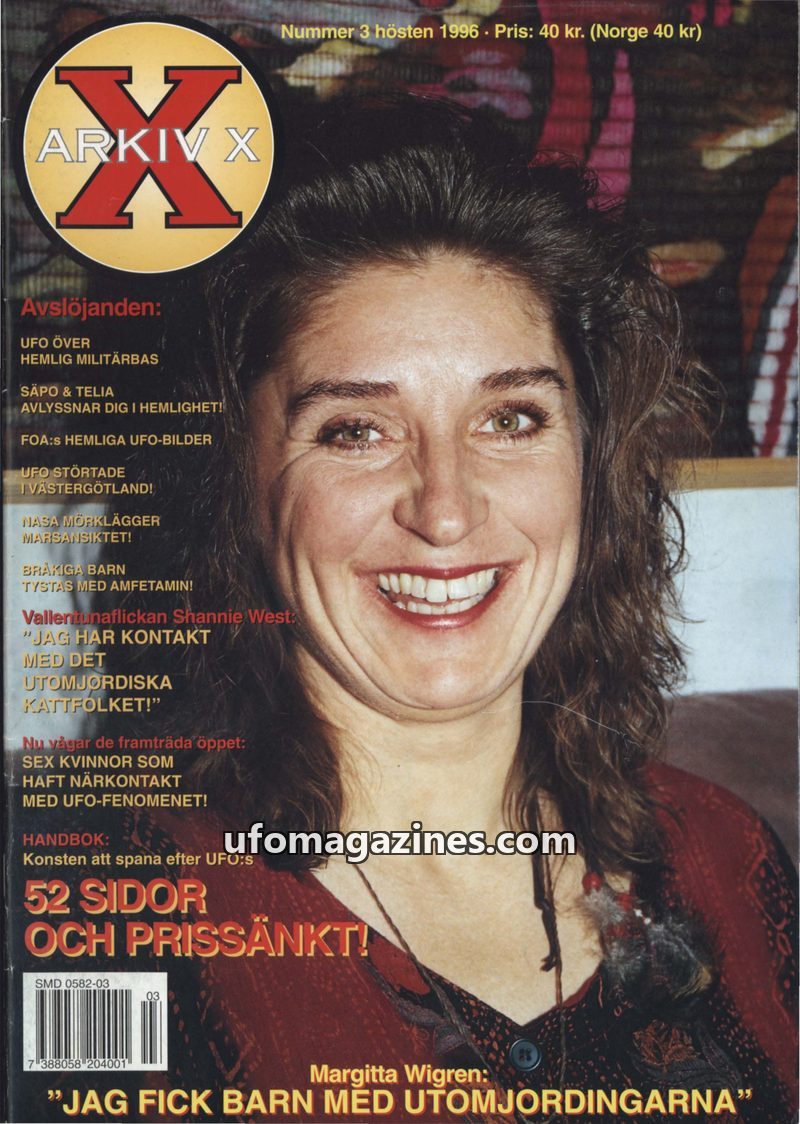 This issue of Arkiv X delves into various UFO phenomena and alleged extraterrestrial encounters. It features the personal account of Margitta Wigren, who claims to have had childre