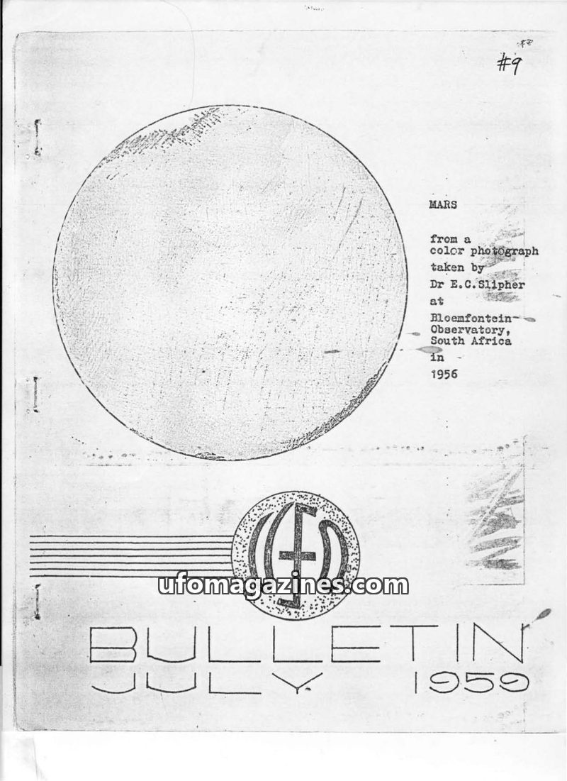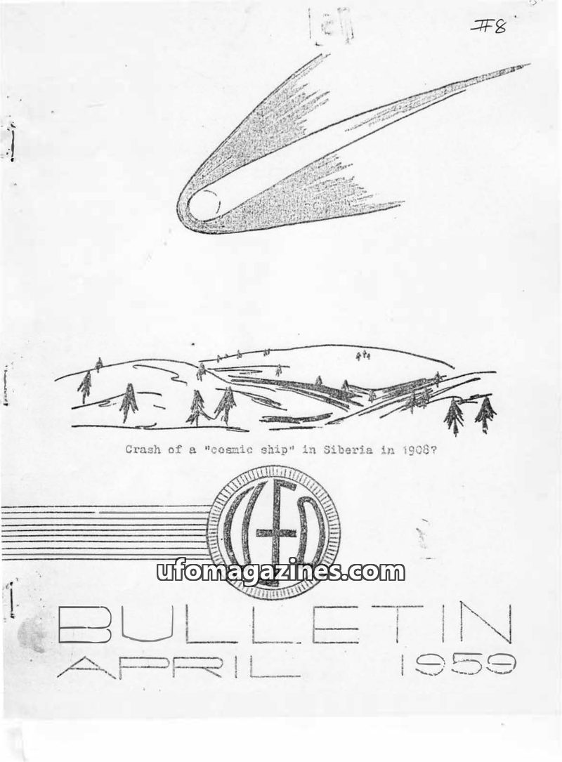 This issue of the UFO Bulletin from April 1959 delves into the 1908 Tunguska event in Siberia, exploring the theory that it was the crash of a "cosmic ship" rather than a meteor. I