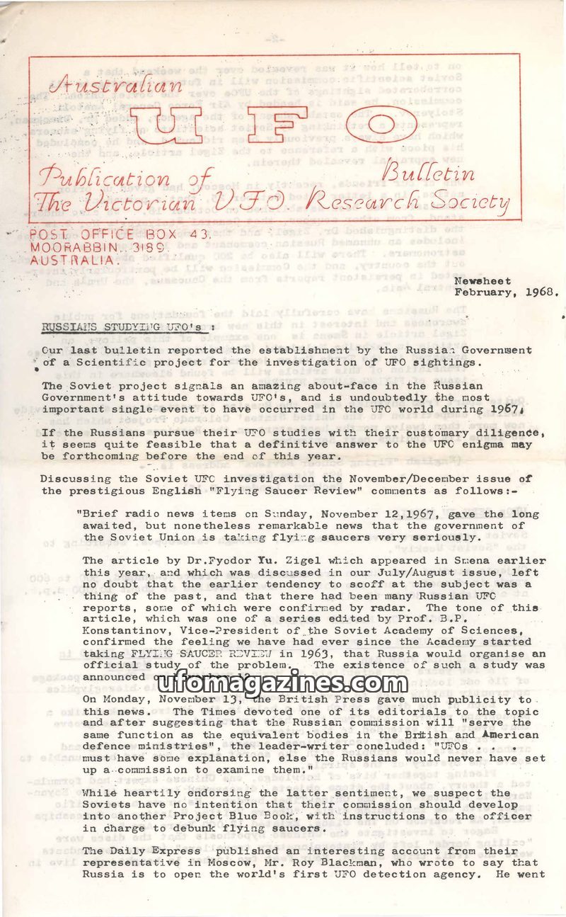 This issue of the Australian UFO Bulletin from February 1968 highlights the significant Soviet government initiative to investigate UFO sightings, marking a shift from previous ske