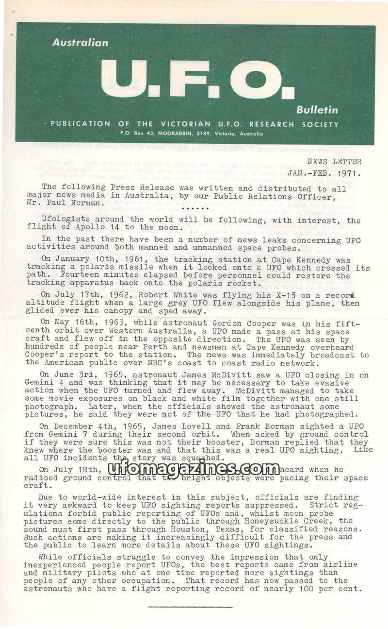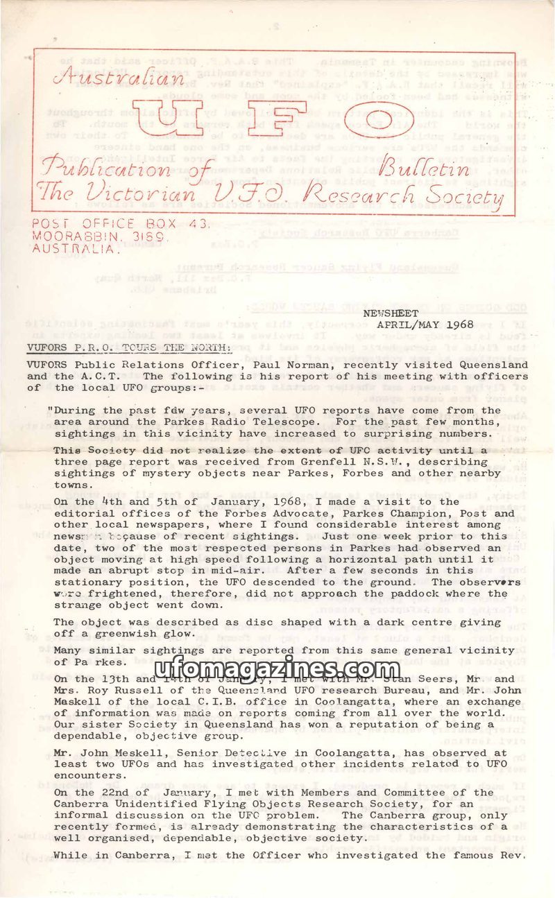 This issue of the Australian UFO Bulletin from April/May 1968 covers VUFORS Public Relations Officer Paul Norman's report on his visits to Queensland and the ACT, detailing UFO sig