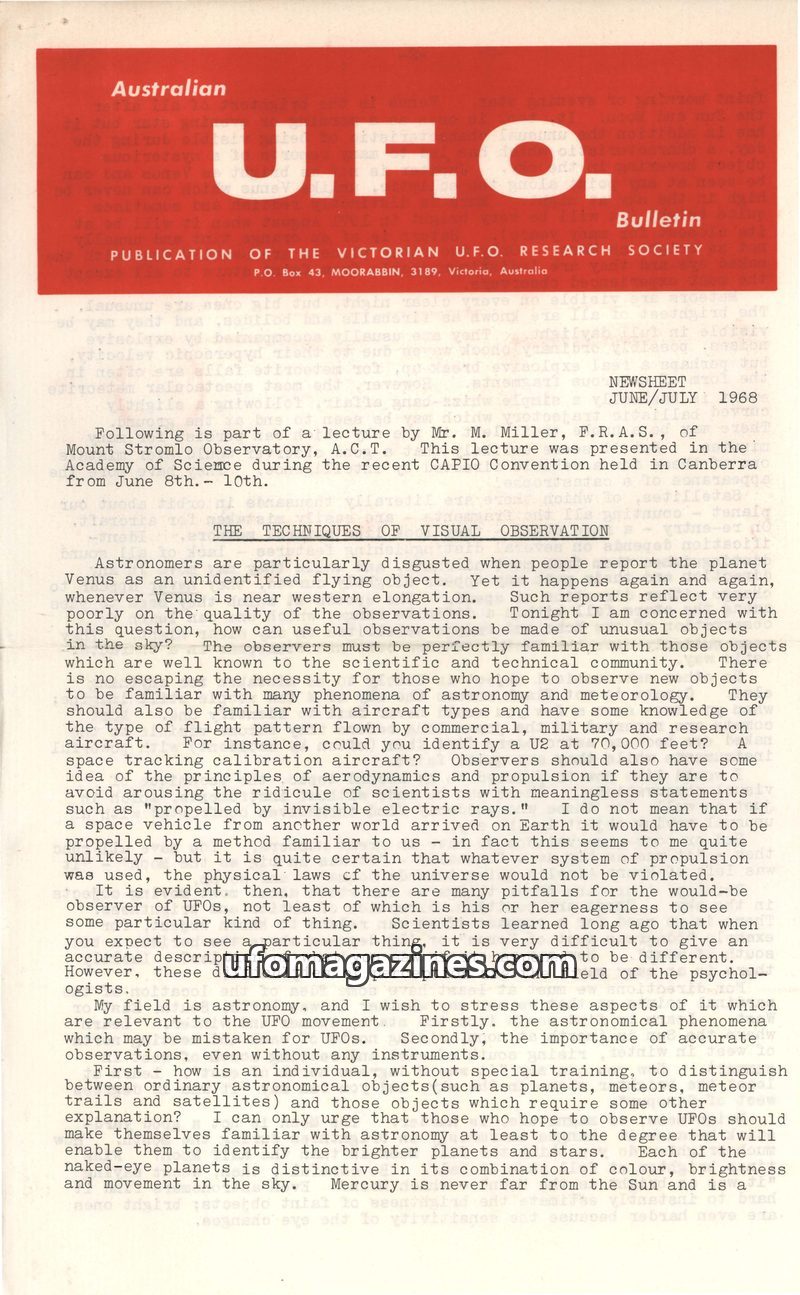 This issue of the Australian UFO Bulletin features a lecture by M. Miller on visual observation techniques, emphasizing the need for astronomers to be familiar with known celestial