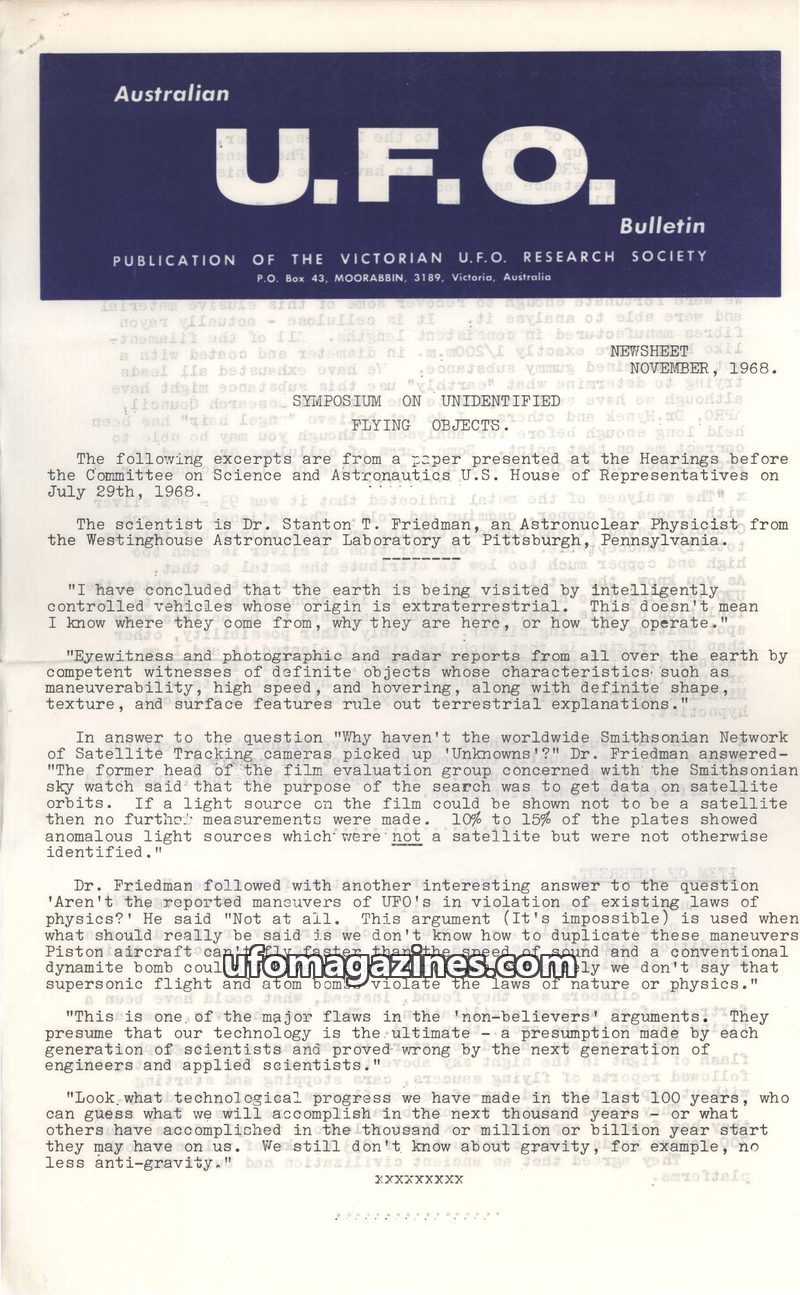 This issue of the Australian UFO Bulletin from November 1968 covers a symposium on unidentified flying objects, featuring insights from Dr. Stanton T. Friedman who posits extraterr