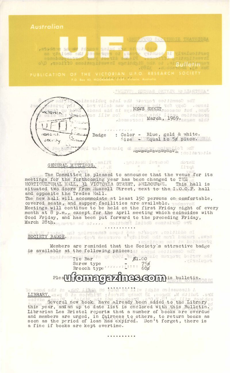 The March 1969 U.F.O. Bulletin announces a venue change for the Victorian UFO Research Society's meetings to the Horticultural Hall in Melbourne. It outlines the planned agenda for