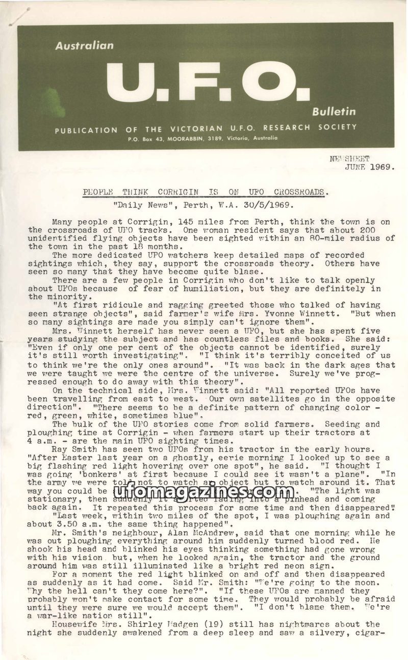 This issue of the UFO Bulletin focuses on UFO activity in Australia, particularly around Corrigin, Western Australia, where residents report numerous sightings. The publication det