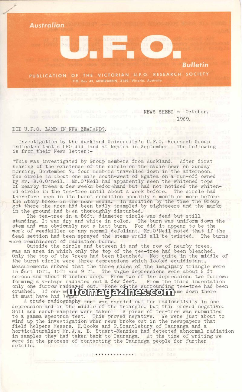 This issue of the UFO Bulletin covers a range of topics including a potential UFO landing in Ngatea, New Zealand, investigated by the Auckland University's U.F.O. Research Group. I