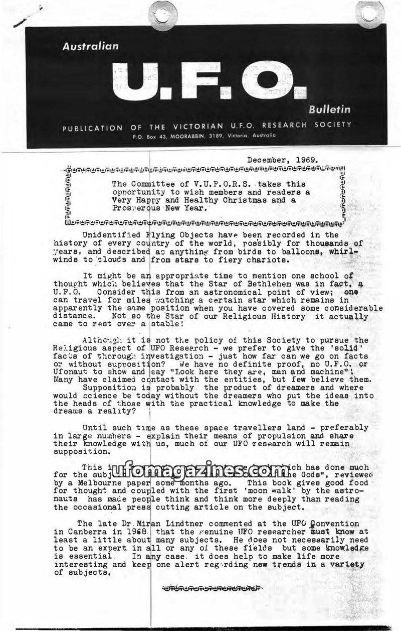 This issue of the U.F.O. Bulletin from December 1969, published by the Victorian U.F.O. Research Society, offers holiday greetings and reflections on UFO research. It discusses the