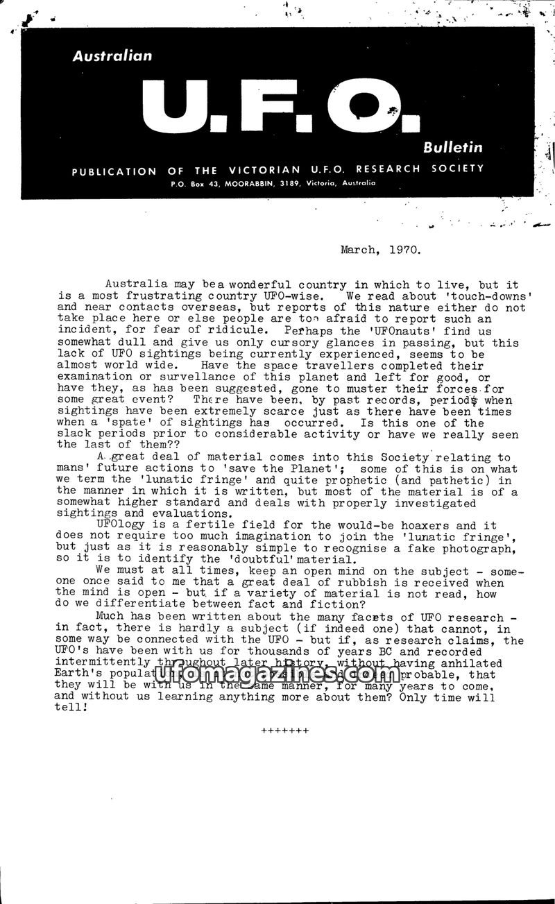 This issue of the U.F.O. Bulletin from March 1970 highlights Australia's perceived lack of UFO sightings compared to overseas reports. It includes an article reprinting a theory th