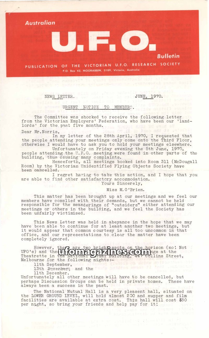 The June 1970 issue of the Australian U.F.O. Bulletin announces the cancellation of meetings due to landlord issues and details new tentative bookings at the National Mutual Buildi