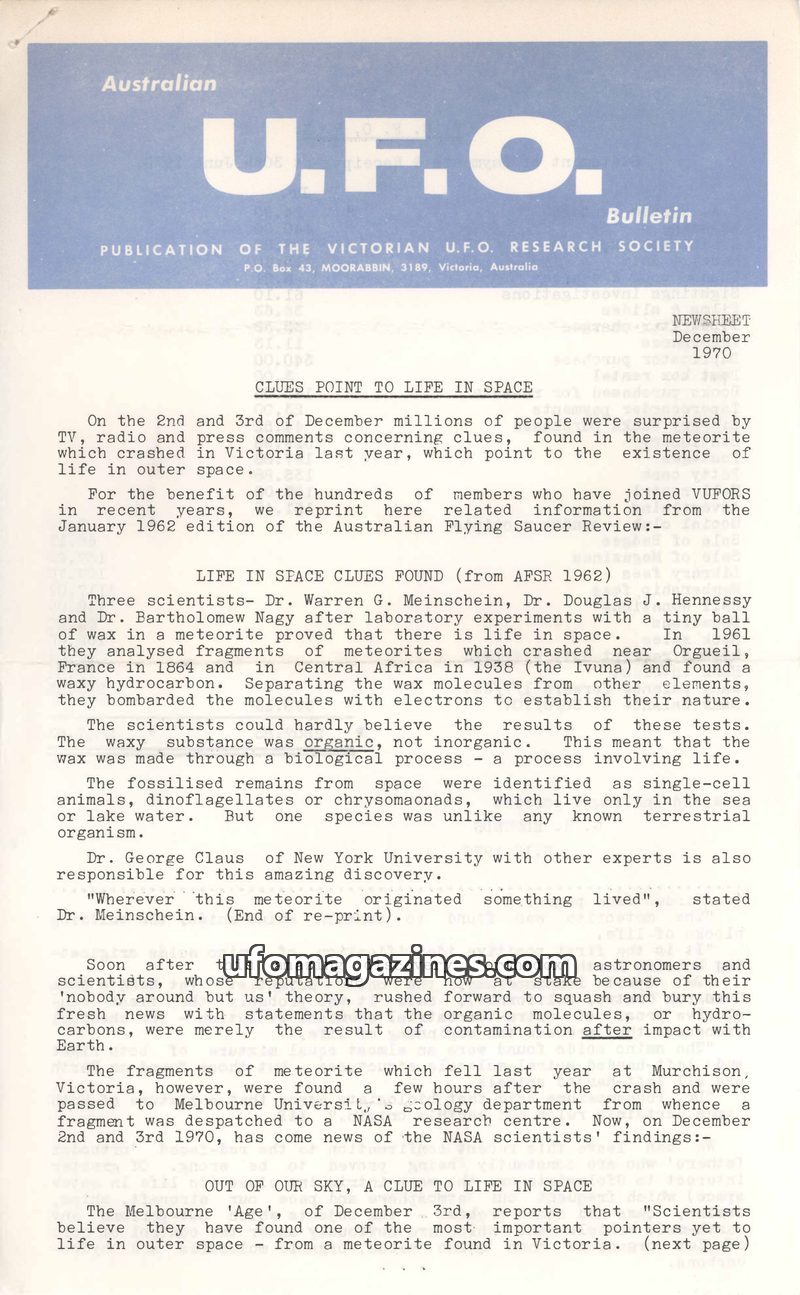 This issue of the U.F.O. Bulletin focuses on evidence suggesting life beyond Earth. It reprints a 1962 report detailing the discovery of organic molecules, identified as single-cel