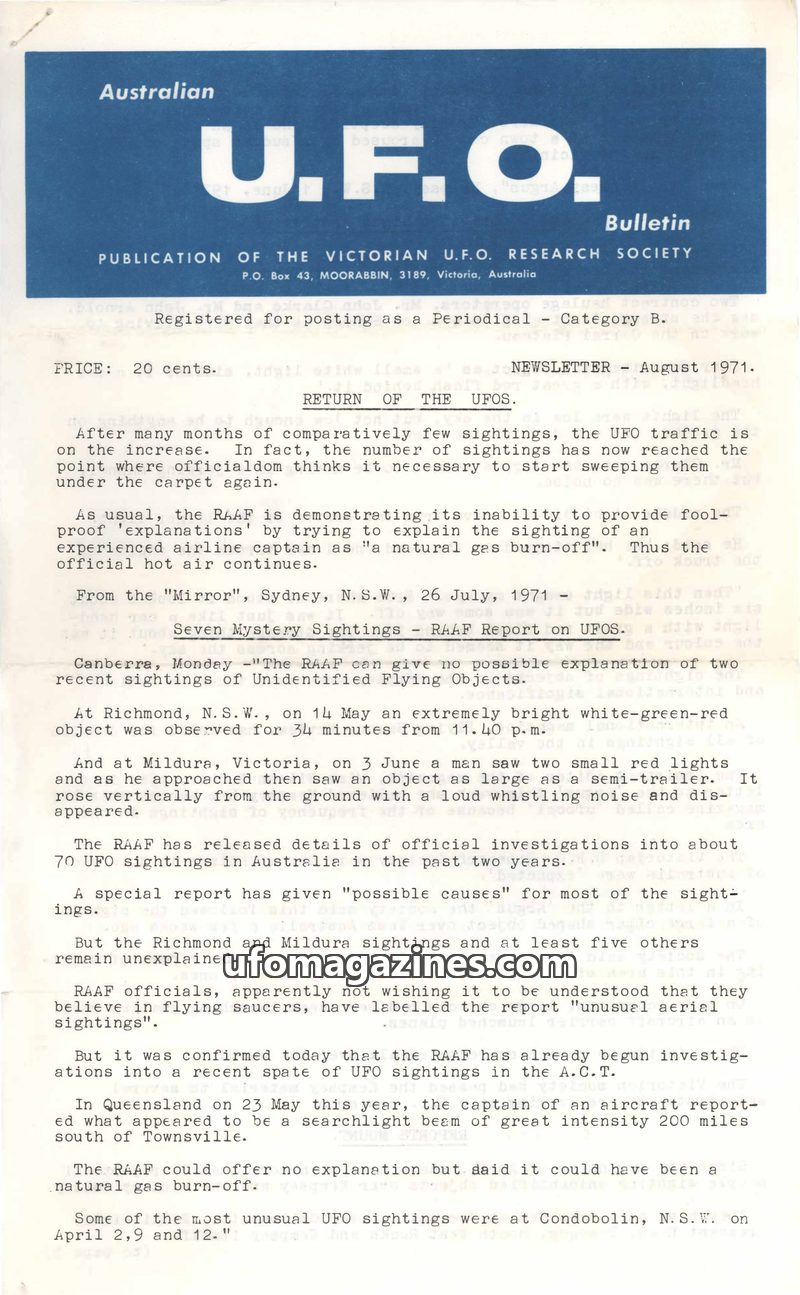 The August 1971 issue of the Australian U.F.O. Bulletin notes a significant increase in UFO sightings across Australia, prompting the RAAF to release a report on investigations int