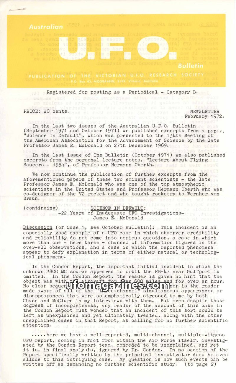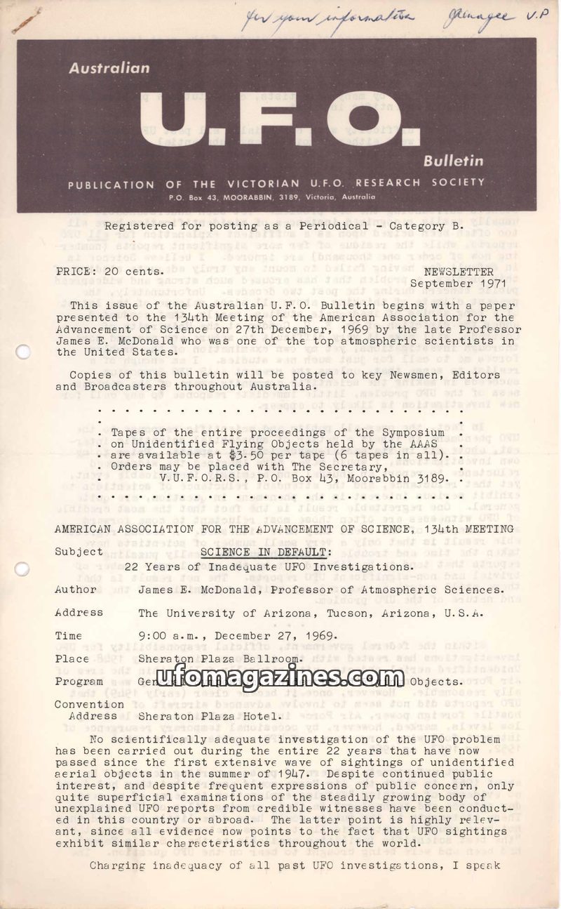 This issue of the Australian UFO Bulletin features a paper by Professor James E. McDonald, a prominent atmospheric scientist, presented at the 134th Meeting of the American Associa