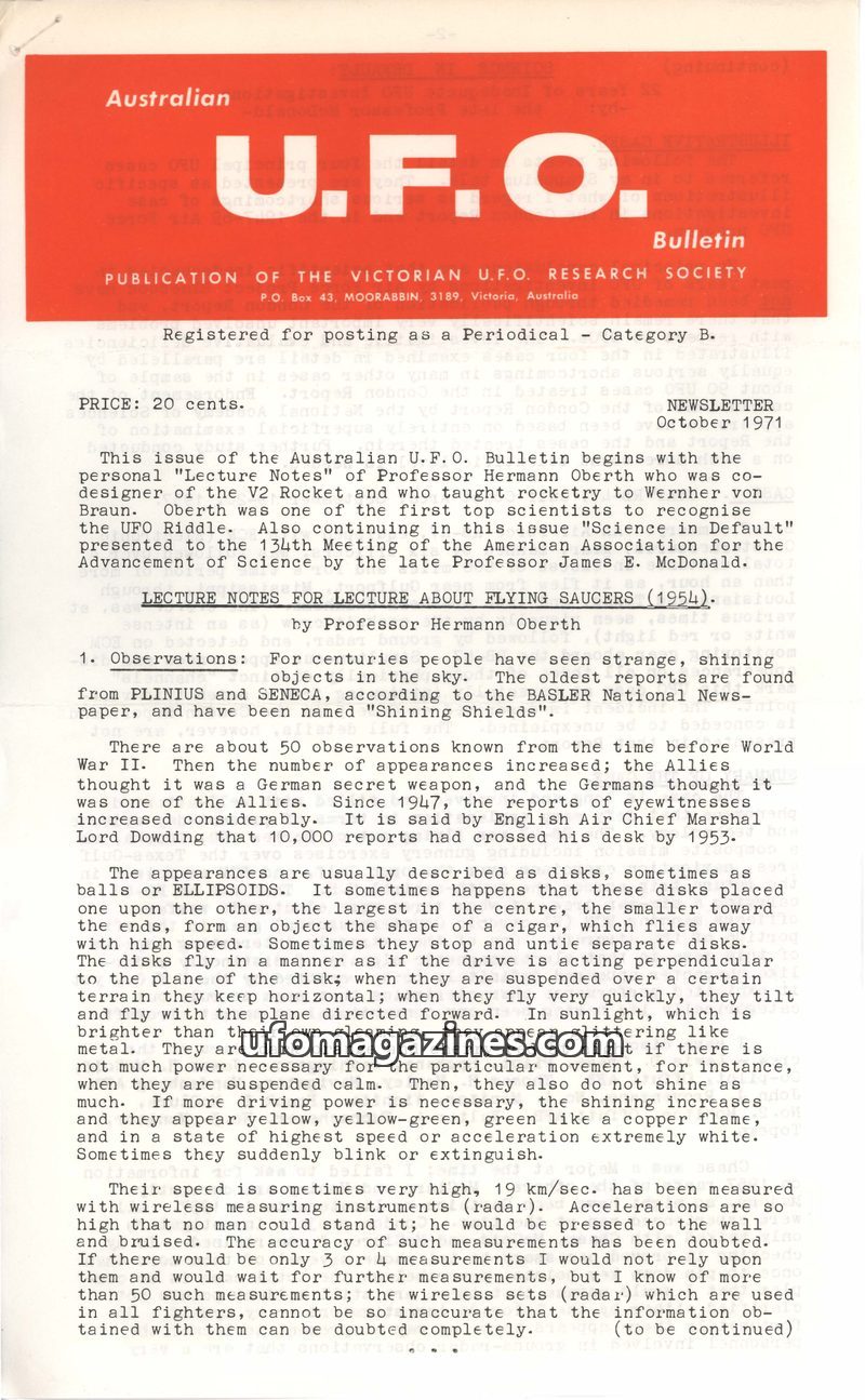 This issue of the U.F.O. Bulletin features lecture notes from Professor Hermann Oberth on flying saucers, dating back to 1954, and includes a detailed account of the 1957 USAF RB-4