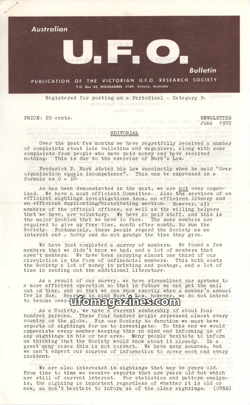 This issue of the Australian U.F.O. Bulletin addresses issues of organization and efficiency within the Victorian U.F.O. Research Society, referencing 'Nurk's Law'. It continues th
