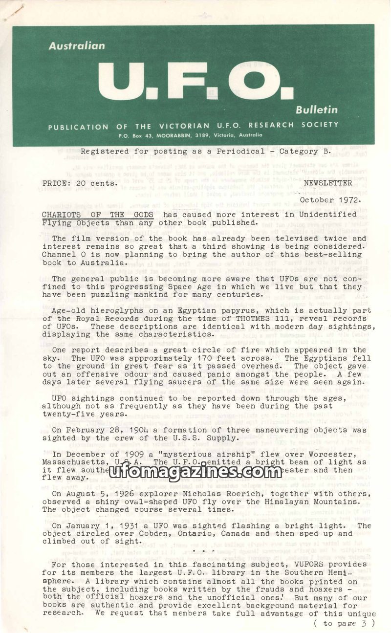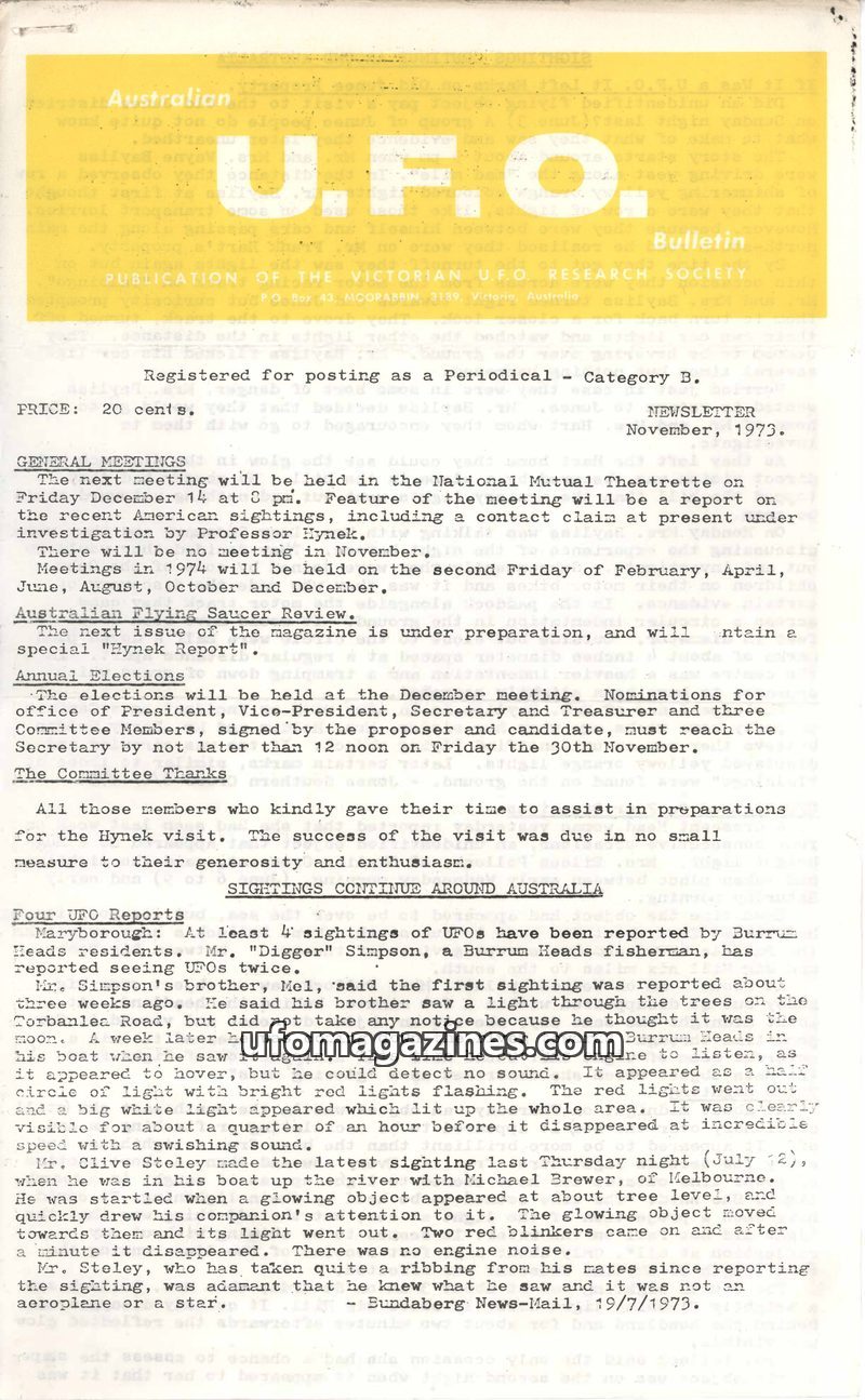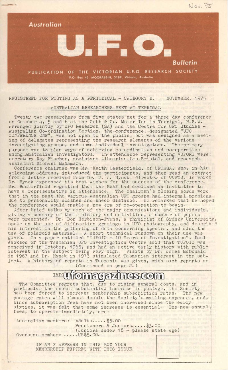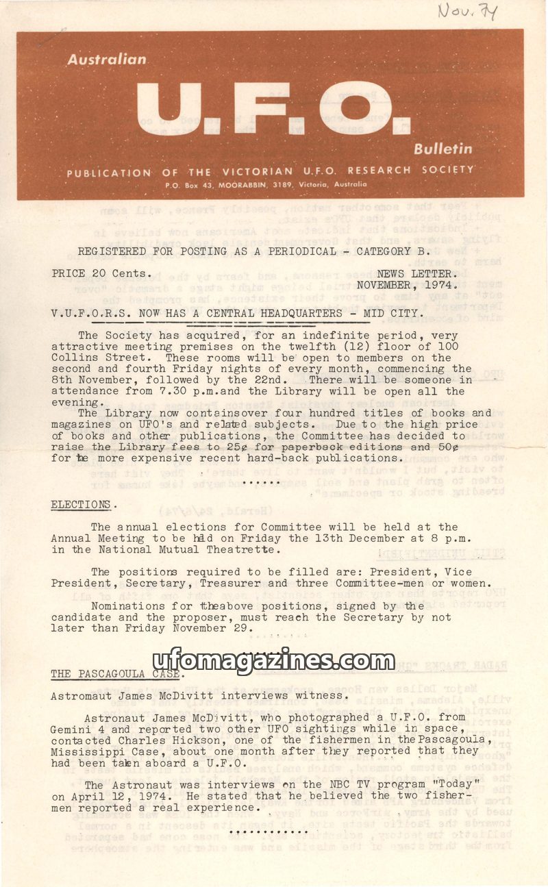 The November 1974 issue of the Australian U.F.O. Bulletin announces the establishment of a central headquarters for the Victorian U.F.O. Research Society (VUFORS) in Mid City, Melb