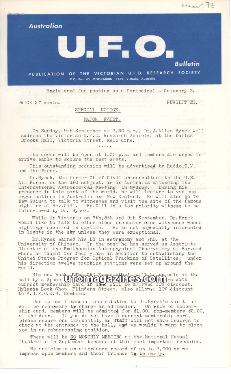 This issue of the Australian UFO Bulletin from Summer 1973 highlights a major event: Dr. J. Allen Hynek, former U.S. Air Force consultant, addressing the Victorian UFO Research Soc