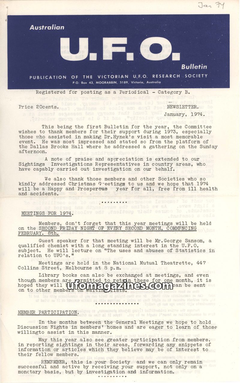 The January 1974 U.F.O. Bulletin from the Victorian U.F.O. Research Society covers various topics including a review of 1973, upcoming meetings, and discussions on physics and UFOs