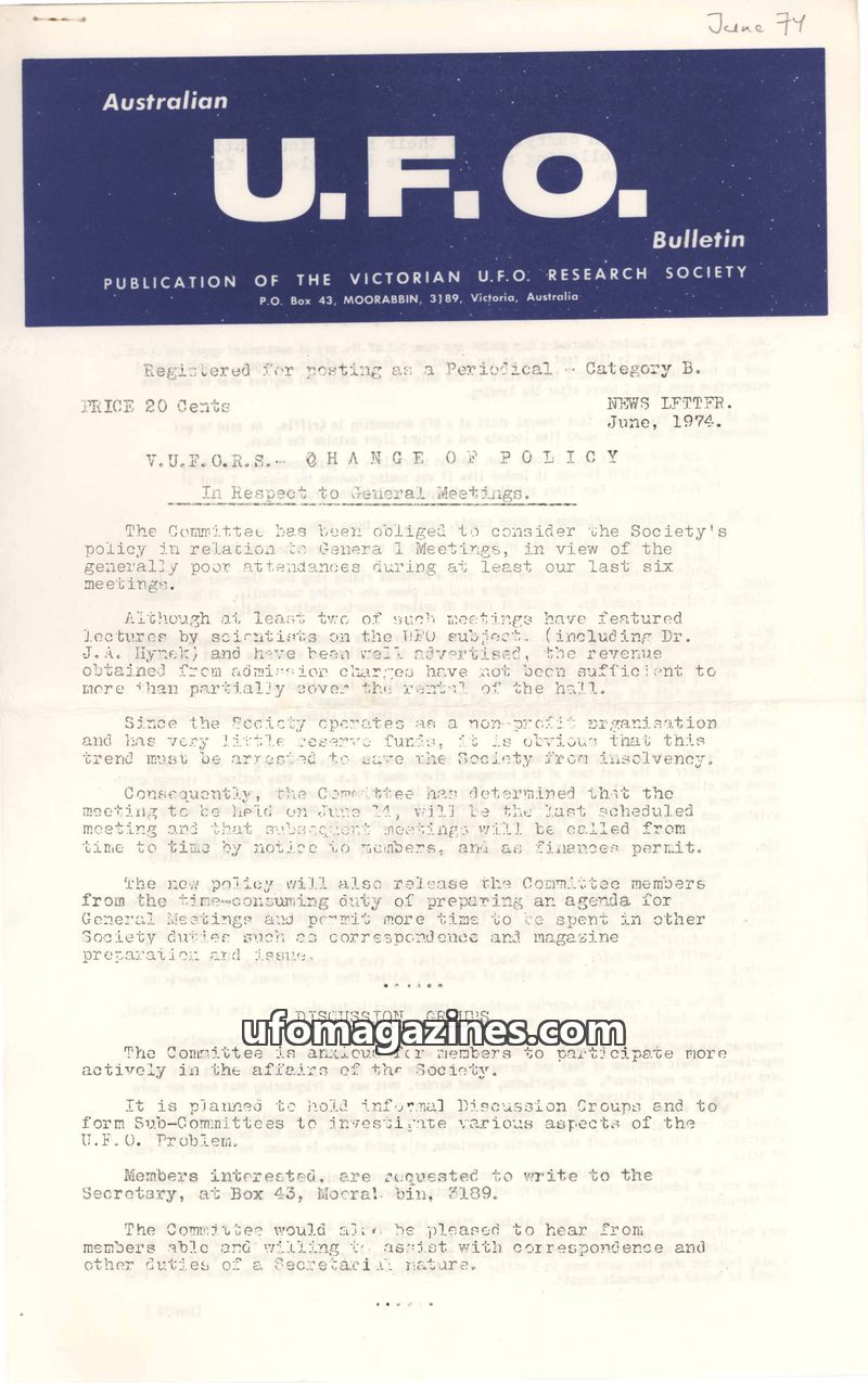 This issue of the Australian U.F.O. Bulletin from June 1974 details a significant policy change for the Victorian U.F.O. Research Society, moving away from scheduled general meetin
