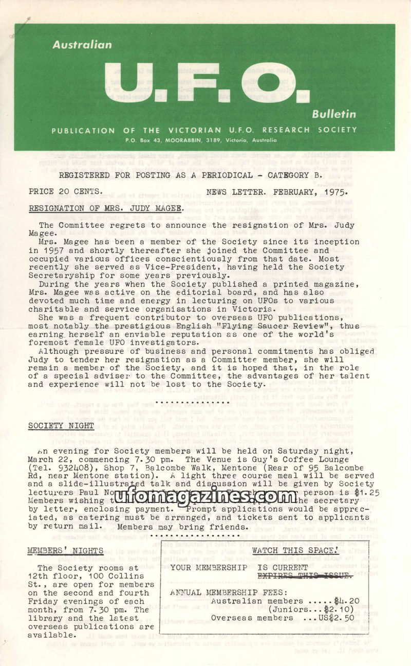This issue of the UFO Bulletin from February 1975 details the resignation of Mrs. Judy Magee, a long-standing member and former Vice-President of the Victorian UFO Research Society
