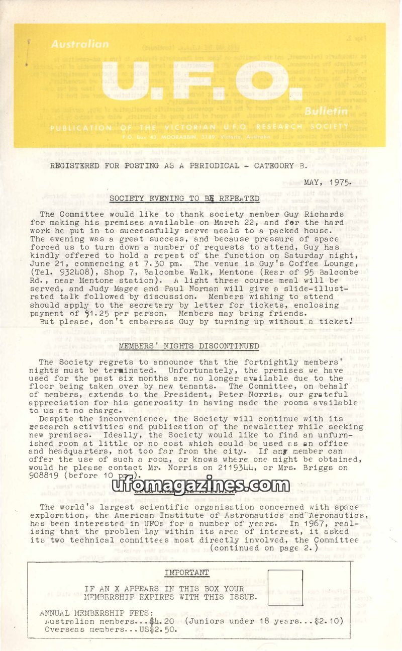 This issue of the U.F.O. Bulletin from May 1975 covers a range of topics including a repeated society evening, the discontinuation of members' nights, and the involvement of the Am