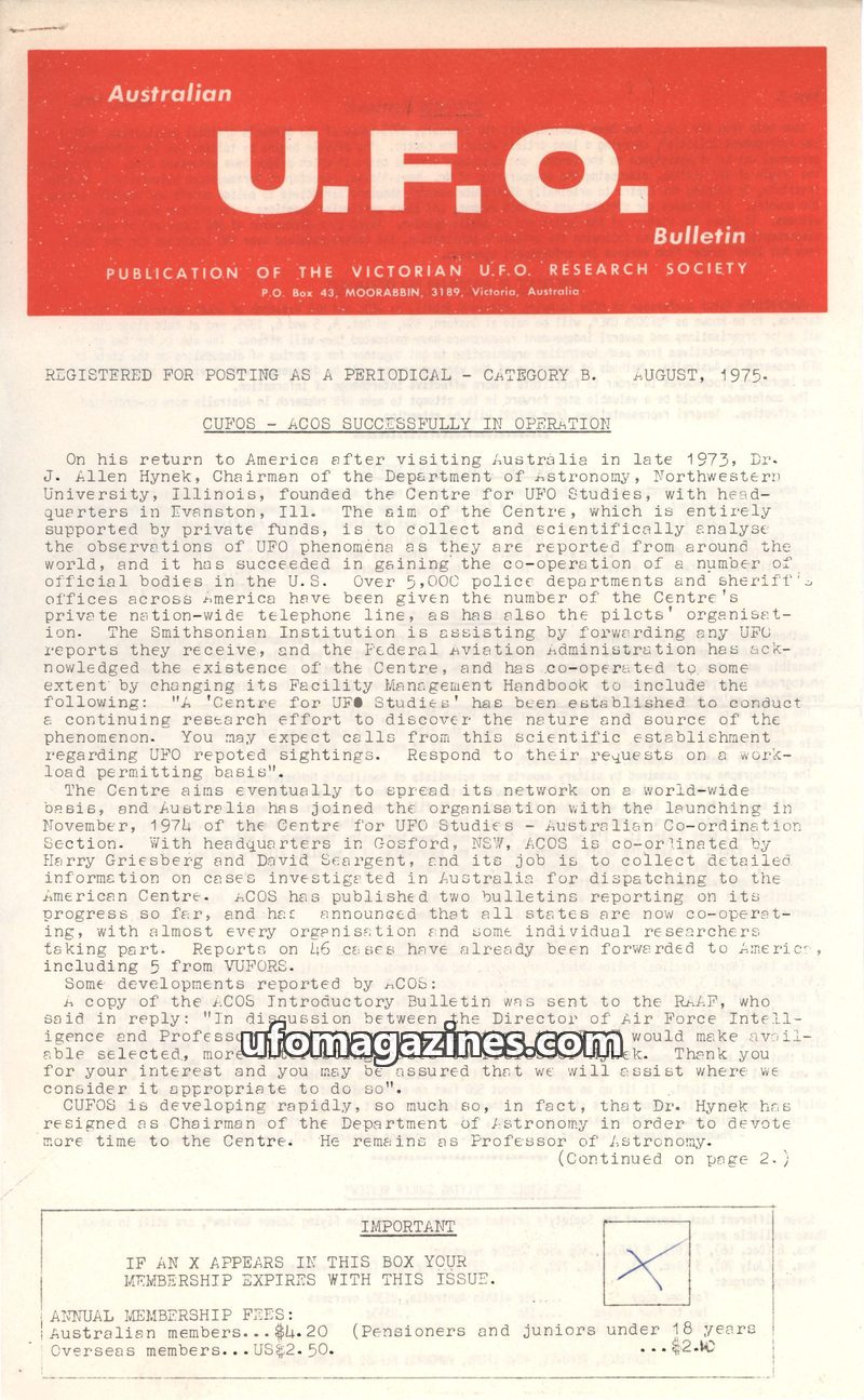 This issue of the UFO Bulletin details the operations of the Centre for UFO Studies (CUFOS) and its Australian Co-ordination Section (ACOS), highlighting their efforts to collect a