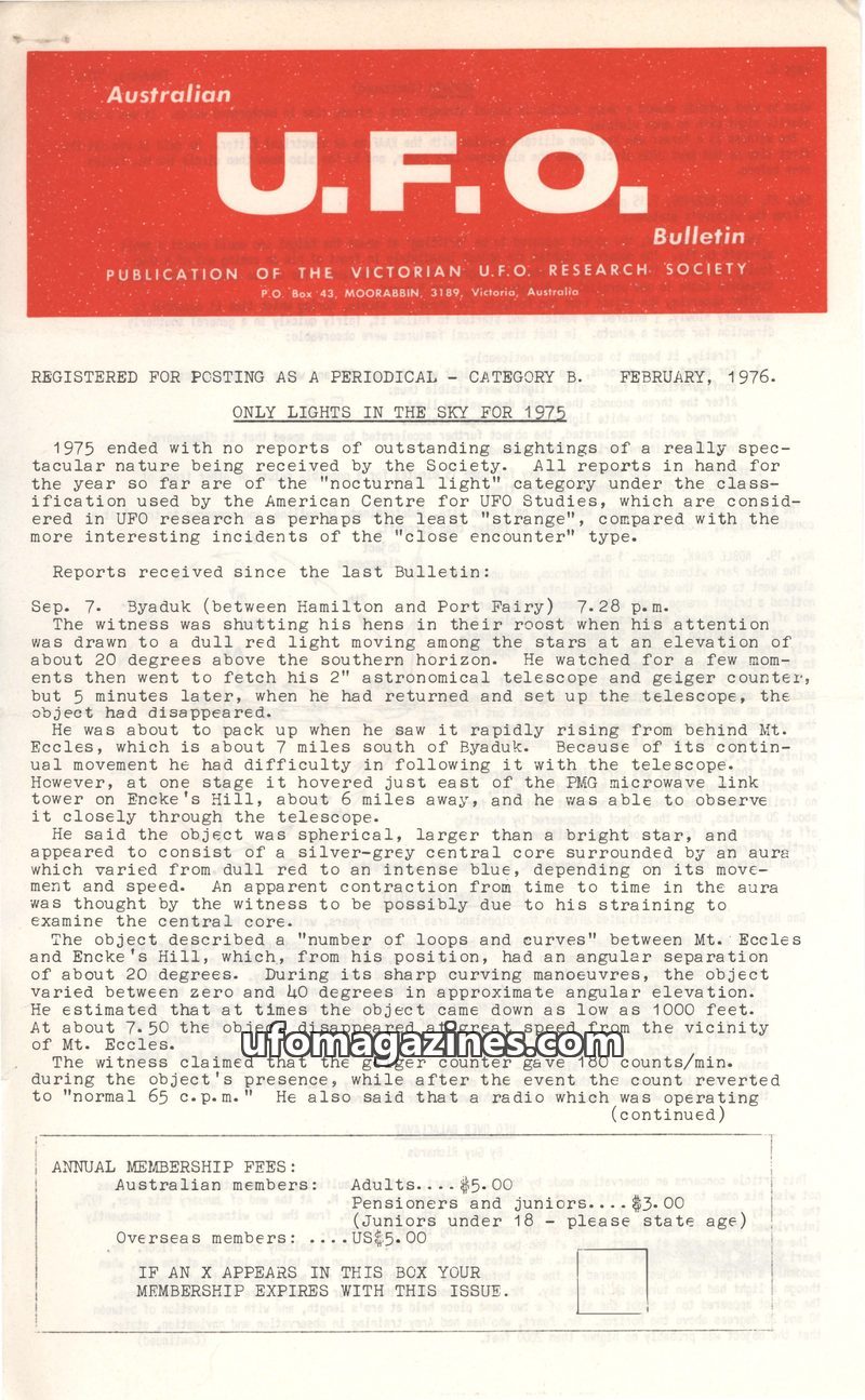 This issue of the U.F.O. Bulletin from February 1976 focuses on 'nocturnal light' sightings from 1975, considered less 'strange' than 'close encounters'. It details several reports