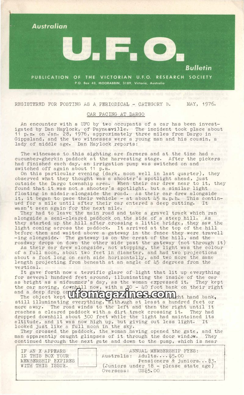 This issue of the U.F.O. Bulletin from May 1976 details numerous UFO sightings across Australia and New Zealand. Key reports include a 'car pacing' incident near Dargo, Victoria, w